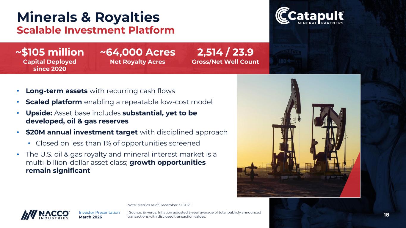 17Investor Presentation March 2026 Contract Mining Proven Model with Expansion Opportunity • Long-term contracts create exponential growth through compounding • Established relationships with several of the top 10 U.S. aggregates producers • Embedded within customer operations • Contract miner at Thacker Pass, world’s largest proven lithium reserve (located in Nevada, and is owned through a joint venture between Lithium Americas Corp. and General Motors Holdings LLC) • Geographic and mineral expansion beyond core markets Note: Metrics as of December 31, 2025 21 +200% 34 +225% Number of Mining Locations 10-Year Growth: Mining Locations Number of Draglines 10-Year Growth: Draglines
