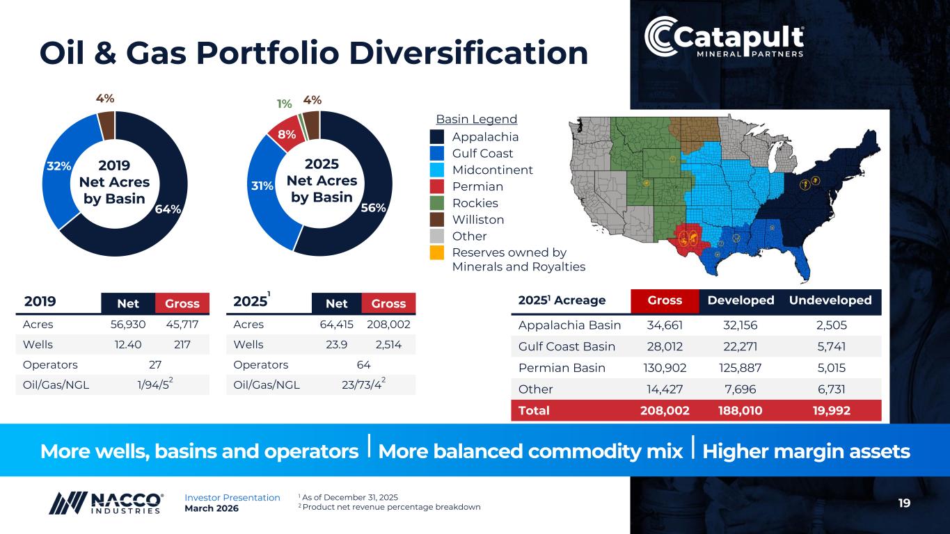 18Investor Presentation March 2026 Minerals & Royalties Scalable Investment Platform • Long-term assets with recurring cash flows • Scaled platform enabling a repeatable low-cost model • Upside: Asset base includes substantial, yet to be developed, oil & gas reserves • $20M annual investment target with disciplined approach • Closed on less than 1% of opportunities screened • The U.S. oil & gas royalty and mineral interest market is a multi-billion-dollar asset class; growth opportunities remain significant1 1 Source: Enverus. Inflation adjusted 5-year average of total publicly announced transactions with disclosed transaction values. Note: Metrics as of December 31, 2025 ~$105 million ~64,000 Acres 2,514 / 23.9 Capital Deployed since 2020 Net Royalty Acres Gross/Net Well Count