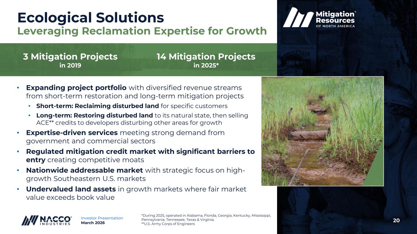 20Investor Presentation March 2026 Ecological Solutions Leveraging Reclamation Expertise for Growth • Expanding project portfolio with diversified revenue streams from short-term restoration and long-term mitigation projects • Short-term: Reclaiming disturbed land for specific customers • Long-term: Restoring disturbed land to its natural state, then selling ACE** credits to developers disturbing other areas for growth • Expertise-driven services meeting strong demand from government and commercial sectors • Regulated mitigation credit market with significant barriers to entry creating competitive moats • Nationwide addressable market with strategic focus on high- growth Southeastern U.S. markets • Undervalued land assets in growth markets where fair market value exceeds book value *During 2025, operated in Alabama, Florida, Georgia, Kentucky, Mississippi, Pennsylvania, Tennessee, Texas & Virginia. **U.S. Army Corps of Engineers 3 Mitigation Projects 14 Mitigation Projects in 2019 in 2025*