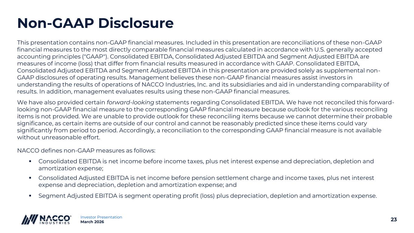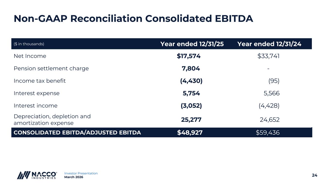 23Investor Presentation March 2026 Non-GAAP Disclosure This presentation contains non-GAAP financial measures. Included in this presentation are reconciliations of these non-GAAP financial measures to the most directly comparable financial measures calculated in accordance with U.S. generally accepted accounting principles ("GAAP"). Consolidated EBITDA, Consolidated Adjusted EBITDA and Segment Adjusted EBITDA are measures of income (loss) that differ from financial results measured in accordance with GAAP. Consolidated EBITDA, Consolidated Adjusted EBITDA and Segment Adjusted EBITDA in this presentation are provided solely as supplemental non- GAAP disclosures of operating results. Management believes these non-GAAP financial measures assist investors in understanding the results of operations of NACCO Industries, Inc. and its subsidiaries and aid in understanding comparability of results. In addition, management evaluates results using these non-GAAP financial measures. We have also provided certain forward-looking statements regarding Consolidated EBITDA. We have not reconciled this forward- looking non-GAAP financial measure to the corresponding GAAP financial measure because outlook for the various reconciling items is not provided. We are unable to provide outlook for these reconciling items because we cannot determine their probable significance, as certain items are outside of our control and cannot be reasonably predicted since these items could vary significantly from period to period. Accordingly, a reconciliation to the corresponding GAAP financial measure is not available without unreasonable effort. NACCO defines non-GAAP measures as follows: ▪ Consolidated EBITDA is net income before income taxes, plus net interest expense and depreciation, depletion and amortization expense; ▪ Consolidated Adjusted EBITDA is net income before pension settlement charge and income taxes, plus net interest expense and depreciation, depletion and amortization expense; and ▪ Segment Adjusted EBITDA is segment operating profit (loss) plus depreciation, depletion and amortization expense.