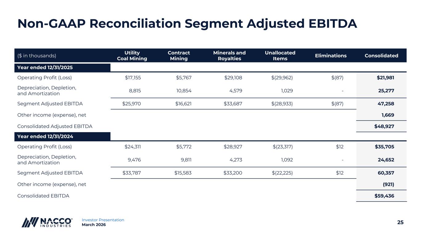 24Investor Presentation March 2026 Non-GAAP Reconciliation Consolidated EBITDA ($ in thousands) Year ended 12/31/25 Year ended 12/31/24 Net Income $17,574 $33,741 Pension settlement charge 7,804 - Income tax benefit (4,430) (95) Interest expense 5,754 5,566 Interest income (3,052) (4,428) Depreciation, depletion and amortization expense 25,277 24,652 CONSOLIDATED EBITDA/ADJUSTED EBITDA $48,927 $59,436