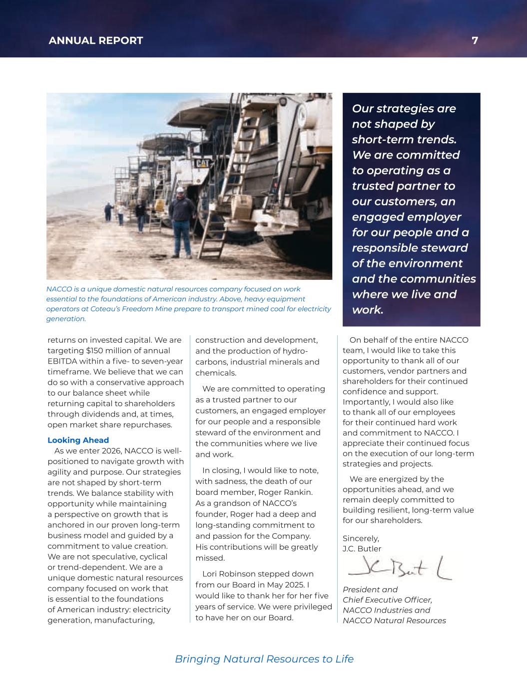 7ANNUAL REPORT Bringing Natural Resources to Life returns on invested capital. We are targeting $150 million of annual EBITDA within a five- to seven-year timeframe. We believe that we can do so with a conservative approach to our balance sheet while returning capital to shareholders through dividends and, at times, open market share repurchases. Looking Ahead As we enter 2026, NACCO is well- positioned to navigate growth with agility and purpose. Our strategies are not shaped by short-term trends. We balance stability with opportunity while maintaining a perspective on growth that is anchored in our proven long-term business model and guided by a commitment to value creation. We are not speculative, cyclical or trend-dependent. We are a unique domestic natural resources company focused on work that is essential to the foundations of American industry: electricity generation, manufacturing, construction and development, and the production of hydro- carbons, industrial minerals and chemicals. We are committed to operating as a trusted partner to our customers, an engaged employer for our people and a responsible steward of the environment and the communities where we live and work. In closing, I would like to note, with sadness, the death of our board member, Roger Rankin. As a grandson of NACCO’s founder, Roger had a deep and long-standing commitment to and passion for the Company. His contributions will be greatly missed. Lori Robinson stepped down from our Board in May 2025. I would like to thank her for her five years of service. We were privileged to have her on our Board. NACCO is a unique domestic natural resources company focused on work essential to the foundations of American industry. Above, heavy equipment operators at Coteau’s Freedom Mine prepare to transport mined coal for electricity generation. Our strategies are not shaped by short-term trends. We are committed to operating as a trusted partner to our customers, an engaged employer for our people and a responsible steward of the environment and the communities where we live and work. On behalf of the entire NACCO team, I would like to take this opportunity to thank all of our customers, vendor partners and shareholders for their continued confidence and support. Importantly, I would also like to thank all of our employees for their continued hard work and commitment to NACCO. I appreciate their continued focus on the execution of our long-term strategies and projects. We are energized by the opportunities ahead, and we remain deeply committed to building resilient, long-term value for our shareholders. Sincerely, J.C. Butler President and Chief Executive Officer, NACCO Industries and NACCO Natural Resources 35425_NACCO_Rev0_3-18.pdf 7 2026/3/10 10:41˜AM