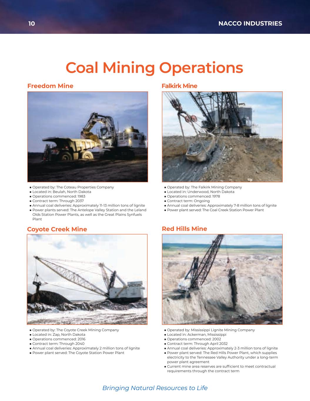 10 NACCO INDUSTRIES Bringing Natural Resources to Life ■ Operated by: The Coyote Creek Mining Company ■ Located in: Zap, North Dakota ■ Operations commenced: 2016 ■ Contract term: Through 2040 ■ Annual coal deliveries: Approximately 2 million tons of lignite ■ Power plant served: The Coyote Station Power Plant Coyote Creek Mine Freedom Mine ■ Operated by: The Coteau Properties Company ■ Located in: Beulah, North Dakota ■ Operations commenced: 1983 ■ Contract term: Through 2037 ■ Annual coal deliveries: Approximately 11-13 million tons of lignite ■ Power plants served: The Antelope Valley Station and the Leland Olds Station Power Plants, as well as the Great Plains Synfuels Plant Falkirk Mine ■ Operated by: The Falkirk Mining Company ■ Located in: Underwood, North Dakota ■ Operations commenced: 1978 ■ Contract term: Ongoing ■ Annual coal deliveries: Approximately 7-8 million tons of lignite ■ Power plant served: The Coal Creek Station Power Plant Red Hills Mine ■ Operated by: Mississippi Lignite Mining Company ■ Located in: Ackerman, Mississippi ■ Operations commenced: 2002 ■ Contract term: Through April 2032 ■ Annual coal deliveries: Approximately 2-3 million tons of lignite ■ Power plant served: The Red Hills Power Plant, which supplies electricity to the Tennessee Valley Authority under a long-term power plant agreement ■ Current mine area reserves are sufficient to meet contractual requirements through the contract term Coal Mining Operations 35425_NACCO_Rev0_3-18.pdf 10 2026/3/10 10:41˜AM