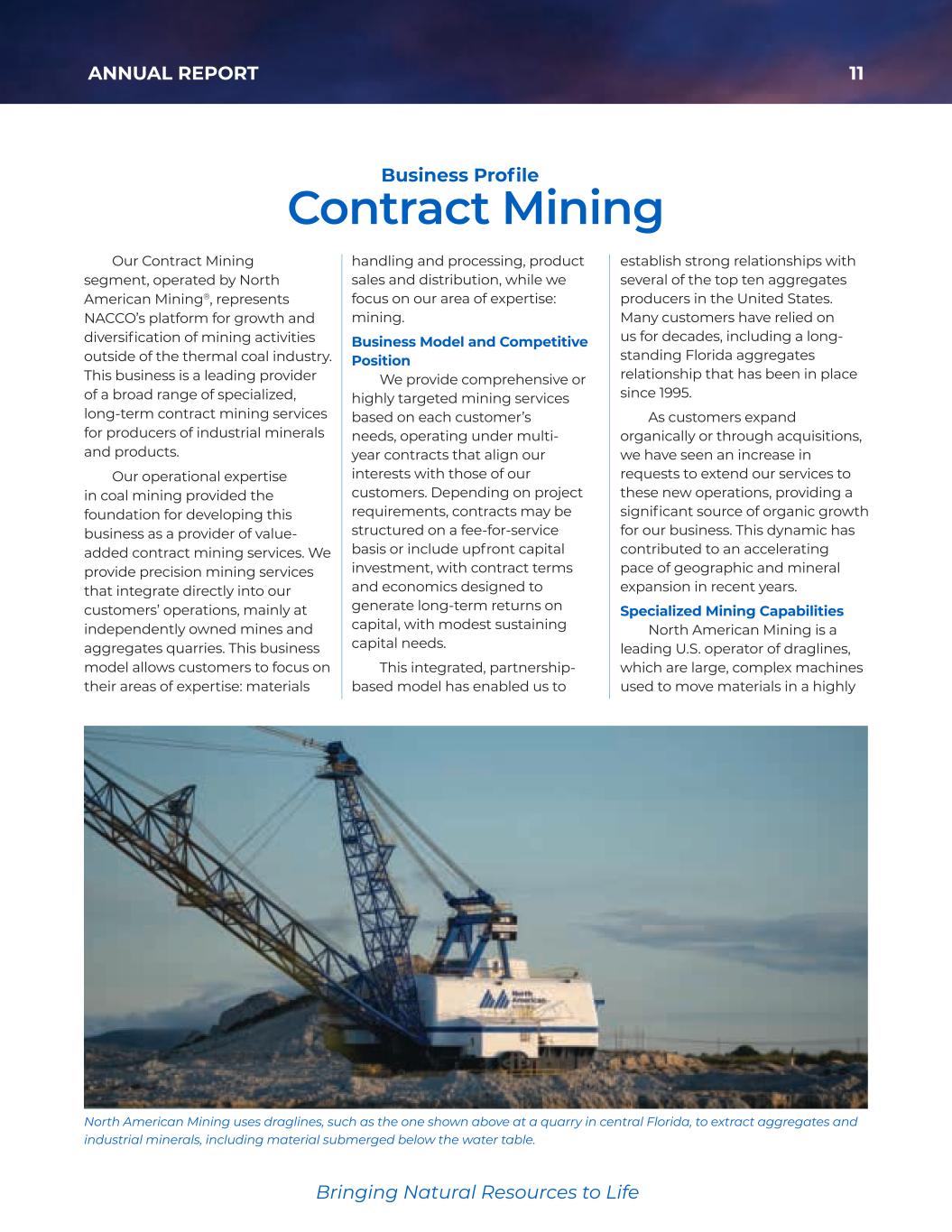11ANNUAL REPORT Bringing Natural Resources to Life Our Contract Mining segment, operated by North American Mining®, represents NACCO’s platform for growth and diversification of mining activities outside of the thermal coal industry. This business is a leading provider of a broad range of specialized, long-term contract mining services for producers of industrial minerals and products. Our operational expertise in coal mining provided the foundation for developing this business as a provider of value- added contract mining services. We provide precision mining services that integrate directly into our customers’ operations, mainly at independently owned mines and aggregates quarries. This business model allows customers to focus on their areas of expertise: materials handling and processing, product sales and distribution, while we focus on our area of expertise: mining. Business Model and Competitive Position We provide comprehensive or highly targeted mining services based on each customer’s needs, operating under multi- year contracts that align our interests with those of our customers. Depending on project requirements, contracts may be structured on a fee-for-service basis or include upfront capital investment, with contract terms and economics designed to generate long-term returns on capital, with modest sustaining capital needs. This integrated, partnership- based model has enabled us to establish strong relationships with several of the top ten aggregates producers in the United States. Many customers have relied on us for decades, including a long- standing Florida aggregates relationship that has been in place since 1995. As customers expand organically or through acquisitions, we have seen an increase in requests to extend our services to these new operations, providing a significant source of organic growth for our business. This dynamic has contributed to an accelerating pace of geographic and mineral expansion in recent years. Specialized Mining Capabilities North American Mining is a leading U.S. operator of draglines, which are large, complex machines used to move materials in a highly North American Mining uses draglines, such as the one shown above at a quarry in central Florida, to extract aggregates and industrial minerals, including material submerged below the water table. Contract Mining Business Profile 35425_NACCO_Rev0_3-18.pdf 11 2026/3/10 10:41˜AM