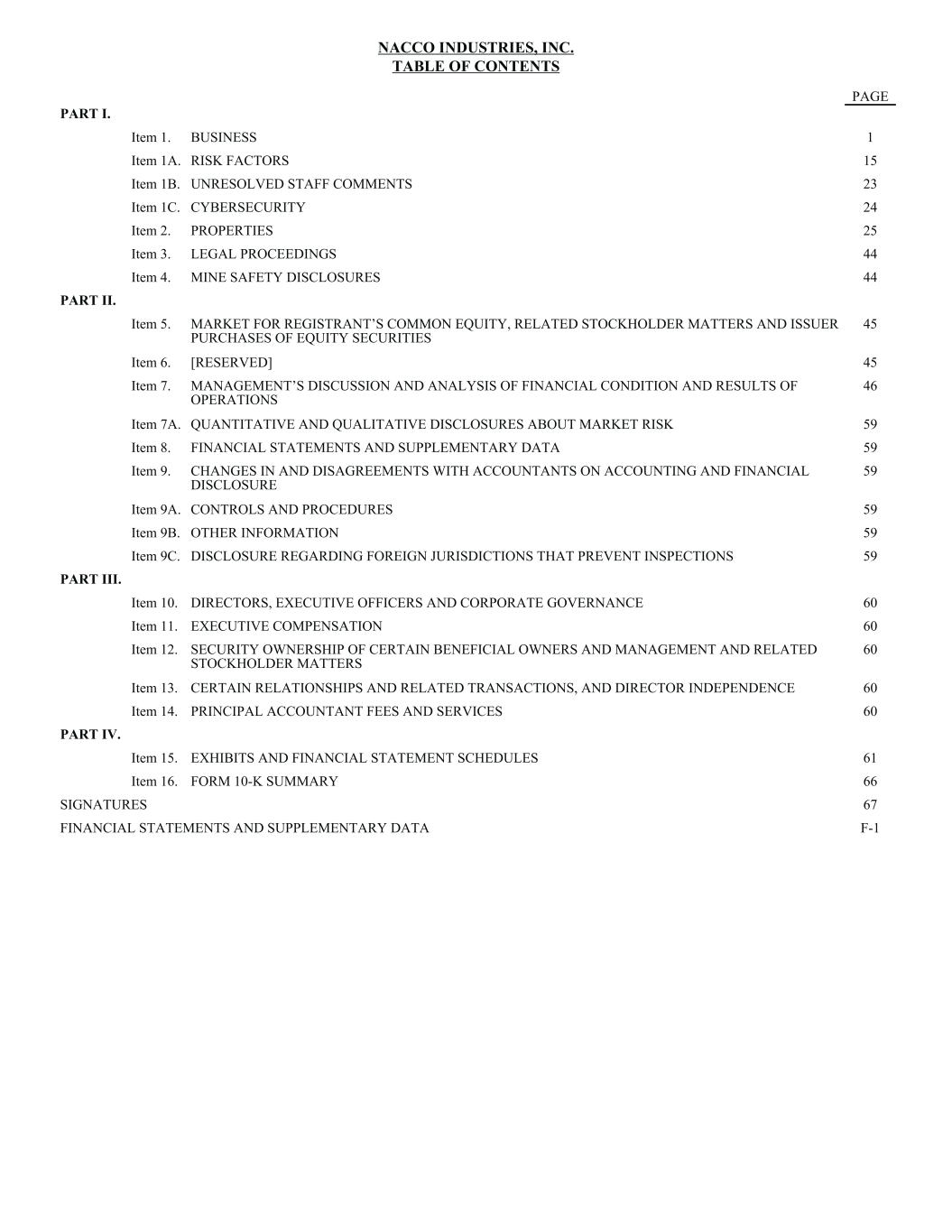 NACCO INDUSTRIES, INC. TABLE OF CONTENTS PAGE PART I. Item 1. BUSINESS 1 Item 1A. RISK FACTORS 15 Item 1B. UNRESOLVED STAFF COMMENTS 23 Item 1C. CYBERSECURITY 24 Item 2. PROPERTIES 25 Item 3. LEGAL PROCEEDINGS 44 Item 4. MINE SAFETY DISCLOSURES 44 PART II. Item 5. MARKET FOR REGISTRANT’S COMMON EQUITY, RELATED STOCKHOLDER MATTERS AND ISSUER PURCHASES OF EQUITY SECURITIES 45 Item 6. [RESERVED] 45 Item 7. MANAGEMENT’S DISCUSSION AND ANALYSIS OF FINANCIAL CONDITION AND RESULTS OF OPERATIONS 46 Item 7A. QUANTITATIVE AND QUALITATIVE DISCLOSURES ABOUT MARKET RISK 59 Item 8. FINANCIAL STATEMENTS AND SUPPLEMENTARY DATA 59 Item 9. CHANGES IN AND DISAGREEMENTS WITH ACCOUNTANTS ON ACCOUNTING AND FINANCIAL DISCLOSURE 59 Item 9A. CONTROLS AND PROCEDURES 59 Item 9B. OTHER INFORMATION 59 Item 9C. DISCLOSURE REGARDING FOREIGN JURISDICTIONS THAT PREVENT INSPECTIONS 59 PART III. Item 10. DIRECTORS, EXECUTIVE OFFICERS AND CORPORATE GOVERNANCE 60 Item 11. EXECUTIVE COMPENSATION 60 Item 12. SECURITY OWNERSHIP OF CERTAIN BENEFICIAL OWNERS AND MANAGEMENT AND RELATED STOCKHOLDER MATTERS 60 Item 13. CERTAIN RELATIONSHIPS AND RELATED TRANSACTIONS, AND DIRECTOR INDEPENDENCE 60 Item 14. PRINCIPAL ACCOUNTANT FEES AND SERVICES 60 PART IV. Item 15. EXHIBITS AND FINANCIAL STATEMENT SCHEDULES 61 Item 16. FORM 10-K SUMMARY 66 SIGNATURES 67 FINANCIAL STATEMENTS AND SUPPLEMENTARY DATA F-1