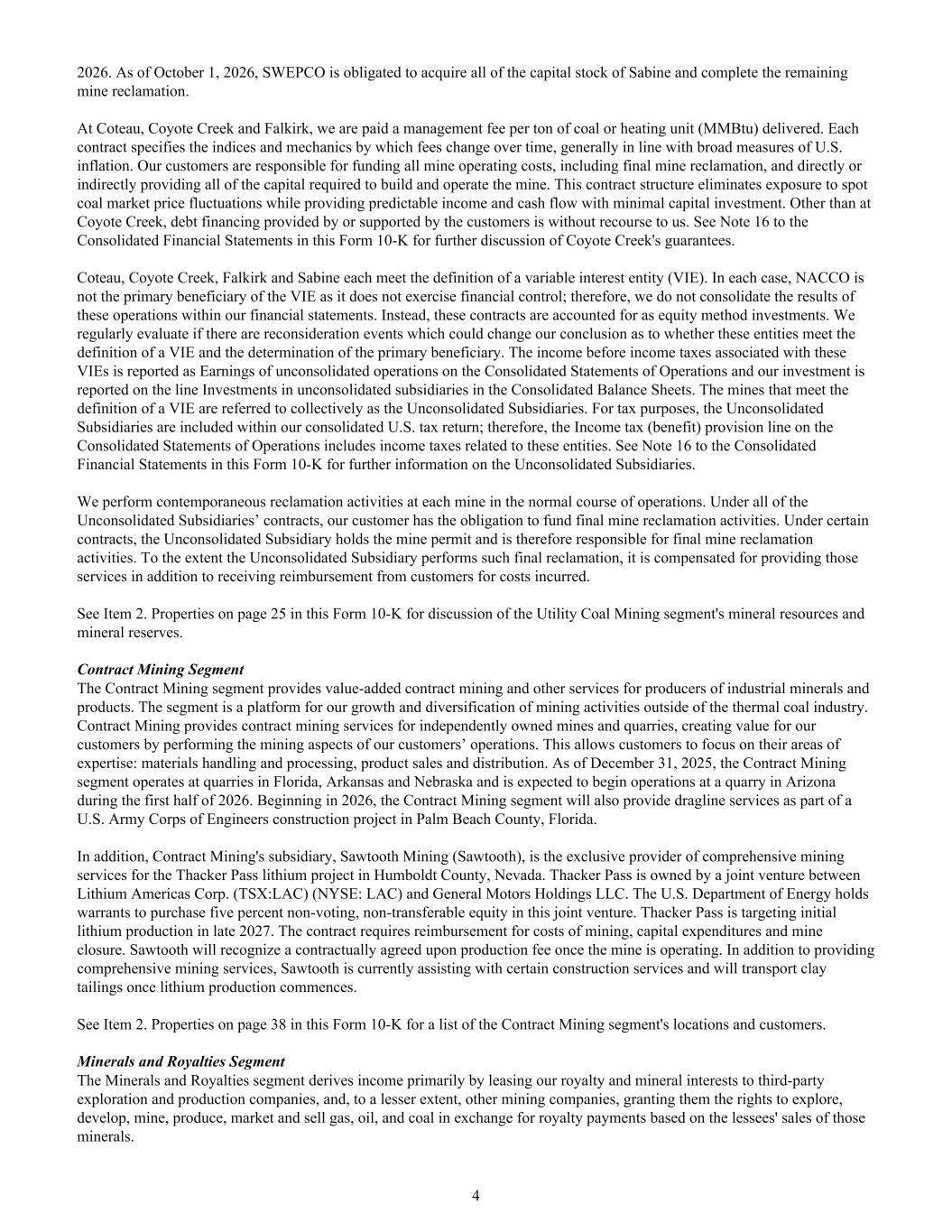 2026. As of October 1, 2026, SWEPCO is obligated to acquire all of the capital stock of Sabine and complete the remaining mine reclamation. At Coteau, Coyote Creek and Falkirk, we are paid a management fee per ton of coal or heating unit (MMBtu) delivered. Each contract specifies the indices and mechanics by which fees change over time, generally in line with broad measures of U.S. inflation. Our customers are responsible for funding all mine operating costs, including final mine reclamation, and directly or indirectly providing all of the capital required to build and operate the mine. This contract structure eliminates exposure to spot coal market price fluctuations while providing predictable income and cash flow with minimal capital investment. Other than at Coyote Creek, debt financing provided by or supported by the customers is without recourse to us. See Note 16 to the Consolidated Financial Statements in this Form 10-K for further discussion of Coyote Creek's guarantees. Coteau, Coyote Creek, Falkirk and Sabine each meet the definition of a variable interest entity (VIE). In each case, NACCO is not the primary beneficiary of the VIE as it does not exercise financial control; therefore, we do not consolidate the results of these operations within our financial statements. Instead, these contracts are accounted for as equity method investments. We regularly evaluate if there are reconsideration events which could change our conclusion as to whether these entities meet the definition of a VIE and the determination of the primary beneficiary. The income before income taxes associated with these VIEs is reported as Earnings of unconsolidated operations on the Consolidated Statements of Operations and our investment is reported on the line Investments in unconsolidated subsidiaries in the Consolidated Balance Sheets. The mines that meet the definition of a VIE are referred to collectively as the Unconsolidated Subsidiaries. For tax purposes, the Unconsolidated Subsidiaries are included within our consolidated U.S. tax return; therefore, the Income tax (benefit) provision line on the Consolidated Statements of Operations includes income taxes related to these entities. See Note 16 to the Consolidated Financial Statements in this Form 10-K for further information on the Unconsolidated Subsidiaries. We perform contemporaneous reclamation activities at each mine in the normal course of operations. Under all of the Unconsolidated Subsidiaries’ contracts, our customer has the obligation to fund final mine reclamation activities. Under certain contracts, the Unconsolidated Subsidiary holds the mine permit and is therefore responsible for final mine reclamation activities. To the extent the Unconsolidated Subsidiary performs such final reclamation, it is compensated for providing those services in addition to receiving reimbursement from customers for costs incurred. See Item 2. Properties on page 25 in this Form 10-K for discussion of the Utility Coal Mining segment's mineral resources and mineral reserves. Contract Mining Segment The Contract Mining segment provides value-added contract mining and other services for producers of industrial minerals and products. The segment is a platform for our growth and diversification of mining activities outside of the thermal coal industry. Contract Mining provides contract mining services for independently owned mines and quarries, creating value for our customers by performing the mining aspects of our customers’ operations. This allows customers to focus on their areas of expertise: materials handling and processing, product sales and distribution. As of December 31, 2025, the Contract Mining segment operates at quarries in Florida, Arkansas and Nebraska and is expected to begin operations at a quarry in Arizona during the first half of 2026. Beginning in 2026, the Contract Mining segment will also provide dragline services as part of a U.S. Army Corps of Engineers construction project in Palm Beach County, Florida. In addition, Contract Mining's subsidiary, Sawtooth Mining (Sawtooth), is the exclusive provider of comprehensive mining services for the Thacker Pass lithium project in Humboldt County, Nevada. Thacker Pass is owned by a joint venture between Lithium Americas Corp. (TSX:LAC) (NYSE: LAC) and General Motors Holdings LLC. The U.S. Department of Energy holds warrants to purchase five percent non-voting, non-transferable equity in this joint venture. Thacker Pass is targeting initial lithium production in late 2027. The contract requires reimbursement for costs of mining, capital expenditures and mine closure. Sawtooth will recognize a contractually agreed upon production fee once the mine is operating. In addition to providing comprehensive mining services, Sawtooth is currently assisting with certain construction services and will transport clay tailings once lithium production commences. See Item 2. Properties on page 38 in this Form 10-K for a list of the Contract Mining segment's locations and customers. Minerals and Royalties Segment The Minerals and Royalties segment derives income primarily by leasing our royalty and mineral interests to third-party exploration and production companies, and, to a lesser extent, other mining companies, granting them the rights to explore, develop, mine, produce, market and sell gas, oil, and coal in exchange for royalty payments based on the lessees' sales of those minerals. 4