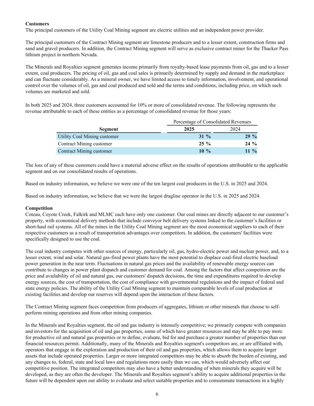 Customers The principal customers of the Utility Coal Mining segment are electric utilities and an independent power provider. The principal customers of the Contract Mining segment are limestone producers and to a lesser extent, construction firms and sand and gravel producers. In addition, the Contract Mining segment will serve as exclusive contract miner for the Thacker Pass lithium project in northern Nevada. The Minerals and Royalties segment generates income primarily from royalty-based lease payments from oil, gas and to a lesser extent, coal producers. The pricing of oil, gas and coal sales is primarily determined by supply and demand in the marketplace and can fluctuate considerably. As a mineral owner, we have limited access to timely information, involvement, and operational control over the volumes of oil, gas and coal produced and sold and the terms and conditions, including price, on which such volumes are marketed and sold. In both 2025 and 2024, three customers accounted for 10% or more of consolidated revenue. The following represents the revenue attributable to each of these entities as a percentage of consolidated revenue for those years: Percentage of Consolidated Revenues Segment 2025 2024 Utility Coal Mining customer 31 % 29 % Contract Mining customer 25 % 24 % Contract Mining customer 10 % 11 % The loss of any of these customers could have a material adverse effect on the results of operations attributable to the applicable segment and on our consolidated results of operations. Based on industry information, we believe we were one of the ten largest coal producers in the U.S. in 2025 and 2024. Based on industry information, we believe that we were the largest dragline operator in the U.S. in 2025 and 2024. Competition Coteau, Coyote Creek, Falkirk and MLMC each have only one customer. Our coal mines are directly adjacent to our customer’s property, with economical delivery methods that include conveyor belt delivery systems linked to the customer’s facilities or short-haul rail systems. All of the mines in the Utility Coal Mining segment are the most economical suppliers to each of their respective customers as a result of transportation advantages over competitors. In addition, the customers' facilities were specifically designed to use the coal. The coal industry competes with other sources of energy, particularly oil, gas, hydro-electric power and nuclear power, and, to a lesser extent, wind and solar. Natural gas-fired power plants have the most potential to displace coal-fired electric baseload power generation in the near term. Fluctuations in natural gas prices and the availability of renewable energy sources can contribute to changes in power plant dispatch and customer demand for coal. Among the factors that affect competition are the price and availability of oil and natural gas, our customers' dispatch decisions, the time and expenditures required to develop energy sources, the cost of transportation, the cost of compliance with governmental regulations and the impact of federal and state energy policies. The ability of the Utility Coal Mining segment to maintain comparable levels of coal production at existing facilities and develop our reserves will depend upon the interaction of these factors. The Contract Mining segment faces competition from producers of aggregates, lithium or other minerals that choose to self- perform mining operations and from other mining companies. In the Minerals and Royalties segment, the oil and gas industry is intensely competitive; we primarily compete with companies and investors for the acquisition of oil and gas properties, some of which have greater resources and may be able to pay more for productive oil and natural gas properties or to define, evaluate, bid for and purchase a greater number of properties than our financial resources permit. Additionally, many of the Minerals and Royalties segment's competitors are, or are affiliated with, operators that engage in the exploration and production of their oil and gas properties, which allows them to acquire larger assets that include operated properties. Larger or more integrated competitors may be able to absorb the burden of existing, and any changes to, federal, state and local laws and regulations more easily than we can, which would adversely affect our competitive position. The integrated competitors may also have a better understanding of when minerals they acquire will be developed, as they are often the developer. The Minerals and Royalties segment’s ability to acquire additional properties in the future will be dependent upon our ability to evaluate and select suitable properties and to consummate transactions in a highly 6