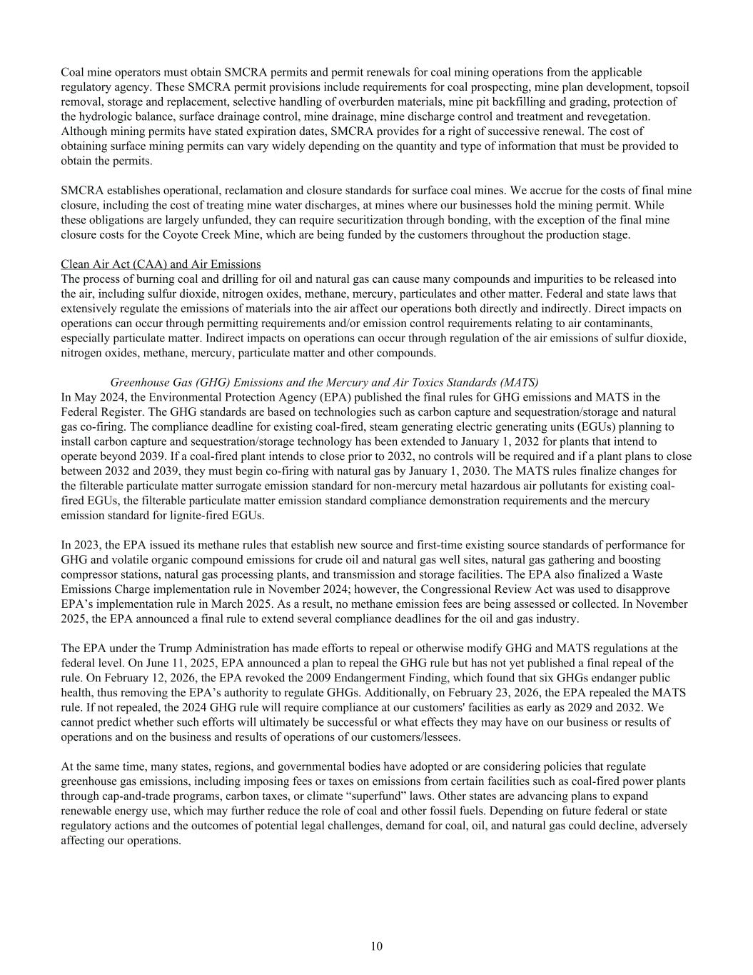 Coal mine operators must obtain SMCRA permits and permit renewals for coal mining operations from the applicable regulatory agency. These SMCRA permit provisions include requirements for coal prospecting, mine plan development, topsoil removal, storage and replacement, selective handling of overburden materials, mine pit backfilling and grading, protection of the hydrologic balance, surface drainage control, mine drainage, mine discharge control and treatment and revegetation. Although mining permits have stated expiration dates, SMCRA provides for a right of successive renewal. The cost of obtaining surface mining permits can vary widely depending on the quantity and type of information that must be provided to obtain the permits. SMCRA establishes operational, reclamation and closure standards for surface coal mines. We accrue for the costs of final mine closure, including the cost of treating mine water discharges, at mines where our businesses hold the mining permit. While these obligations are largely unfunded, they can require securitization through bonding, with the exception of the final mine closure costs for the Coyote Creek Mine, which are being funded by the customers throughout the production stage. Clean Air Act (CAA) and Air Emissions The process of burning coal and drilling for oil and natural gas can cause many compounds and impurities to be released into the air, including sulfur dioxide, nitrogen oxides, methane, mercury, particulates and other matter. Federal and state laws that extensively regulate the emissions of materials into the air affect our operations both directly and indirectly. Direct impacts on operations can occur through permitting requirements and/or emission control requirements relating to air contaminants, especially particulate matter. Indirect impacts on operations can occur through regulation of the air emissions of sulfur dioxide, nitrogen oxides, methane, mercury, particulate matter and other compounds. Greenhouse Gas (GHG) Emissions and the Mercury and Air Toxics Standards (MATS) In May 2024, the Environmental Protection Agency (EPA) published the final rules for GHG emissions and MATS in the Federal Register. The GHG standards are based on technologies such as carbon capture and sequestration/storage and natural gas co-firing. The compliance deadline for existing coal-fired, steam generating electric generating units (EGUs) planning to install carbon capture and sequestration/storage technology has been extended to January 1, 2032 for plants that intend to operate beyond 2039. If a coal-fired plant intends to close prior to 2032, no controls will be required and if a plant plans to close between 2032 and 2039, they must begin co-firing with natural gas by January 1, 2030. The MATS rules finalize changes for the filterable particulate matter surrogate emission standard for non-mercury metal hazardous air pollutants for existing coal- fired EGUs, the filterable particulate matter emission standard compliance demonstration requirements and the mercury emission standard for lignite-fired EGUs. In 2023, the EPA issued its methane rules that establish new source and first-time existing source standards of performance for GHG and volatile organic compound emissions for crude oil and natural gas well sites, natural gas gathering and boosting compressor stations, natural gas processing plants, and transmission and storage facilities. The EPA also finalized a Waste Emissions Charge implementation rule in November 2024; however, the Congressional Review Act was used to disapprove EPA’s implementation rule in March 2025. As a result, no methane emission fees are being assessed or collected. In November 2025, the EPA announced a final rule to extend several compliance deadlines for the oil and gas industry. The EPA under the Trump Administration has made efforts to repeal or otherwise modify GHG and MATS regulations at the federal level. On June 11, 2025, EPA announced a plan to repeal the GHG rule but has not yet published a final repeal of the rule. On February 12, 2026, the EPA revoked the 2009 Endangerment Finding, which found that six GHGs endanger public health, thus removing the EPA’s authority to regulate GHGs. Additionally, on February 23, 2026, the EPA repealed the MATS rule. If not repealed, the 2024 GHG rule will require compliance at our customers' facilities as early as 2029 and 2032. We cannot predict whether such efforts will ultimately be successful or what effects they may have on our business or results of operations and on the business and results of operations of our customers/lessees. At the same time, many states, regions, and governmental bodies have adopted or are considering policies that regulate greenhouse gas emissions, including imposing fees or taxes on emissions from certain facilities such as coal-fired power plants through cap-and-trade programs, carbon taxes, or climate “superfund” laws. Other states are advancing plans to expand renewable energy use, which may further reduce the role of coal and other fossil fuels. Depending on future federal or state regulatory actions and the outcomes of potential legal challenges, demand for coal, oil, and natural gas could decline, adversely affecting our operations. 10