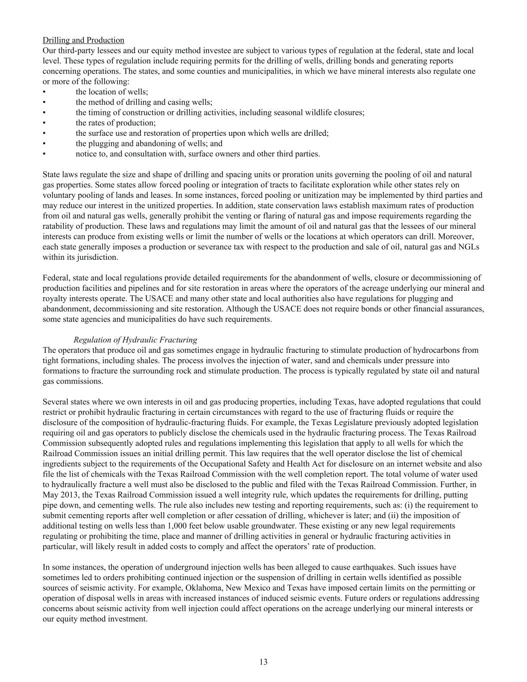 Drilling and Production Our third-party lessees and our equity method investee are subject to various types of regulation at the federal, state and local level. These types of regulation include requiring permits for the drilling of wells, drilling bonds and generating reports concerning operations. The states, and some counties and municipalities, in which we have mineral interests also regulate one or more of the following: • the location of wells; • the method of drilling and casing wells; • the timing of construction or drilling activities, including seasonal wildlife closures; • the rates of production; • the surface use and restoration of properties upon which wells are drilled; • the plugging and abandoning of wells; and • notice to, and consultation with, surface owners and other third parties. State laws regulate the size and shape of drilling and spacing units or proration units governing the pooling of oil and natural gas properties. Some states allow forced pooling or integration of tracts to facilitate exploration while other states rely on voluntary pooling of lands and leases. In some instances, forced pooling or unitization may be implemented by third parties and may reduce our interest in the unitized properties. In addition, state conservation laws establish maximum rates of production from oil and natural gas wells, generally prohibit the venting or flaring of natural gas and impose requirements regarding the ratability of production. These laws and regulations may limit the amount of oil and natural gas that the lessees of our mineral interests can produce from existing wells or limit the number of wells or the locations at which operators can drill. Moreover, each state generally imposes a production or severance tax with respect to the production and sale of oil, natural gas and NGLs within its jurisdiction. Federal, state and local regulations provide detailed requirements for the abandonment of wells, closure or decommissioning of production facilities and pipelines and for site restoration in areas where the operators of the acreage underlying our mineral and royalty interests operate. The USACE and many other state and local authorities also have regulations for plugging and abandonment, decommissioning and site restoration. Although the USACE does not require bonds or other financial assurances, some state agencies and municipalities do have such requirements. Regulation of Hydraulic Fracturing The operators that produce oil and gas sometimes engage in hydraulic fracturing to stimulate production of hydrocarbons from tight formations, including shales. The process involves the injection of water, sand and chemicals under pressure into formations to fracture the surrounding rock and stimulate production. The process is typically regulated by state oil and natural gas commissions. Several states where we own interests in oil and gas producing properties, including Texas, have adopted regulations that could restrict or prohibit hydraulic fracturing in certain circumstances with regard to the use of fracturing fluids or require the disclosure of the composition of hydraulic-fracturing fluids. For example, the Texas Legislature previously adopted legislation requiring oil and gas operators to publicly disclose the chemicals used in the hydraulic fracturing process. The Texas Railroad Commission subsequently adopted rules and regulations implementing this legislation that apply to all wells for which the Railroad Commission issues an initial drilling permit. This law requires that the well operator disclose the list of chemical ingredients subject to the requirements of the Occupational Safety and Health Act for disclosure on an internet website and also file the list of chemicals with the Texas Railroad Commission with the well completion report. The total volume of water used to hydraulically fracture a well must also be disclosed to the public and filed with the Texas Railroad Commission. Further, in May 2013, the Texas Railroad Commission issued a well integrity rule, which updates the requirements for drilling, putting pipe down, and cementing wells. The rule also includes new testing and reporting requirements, such as: (i) the requirement to submit cementing reports after well completion or after cessation of drilling, whichever is later; and (ii) the imposition of additional testing on wells less than 1,000 feet below usable groundwater. These existing or any new legal requirements regulating or prohibiting the time, place and manner of drilling activities in general or hydraulic fracturing activities in particular, will likely result in added costs to comply and affect the operators’ rate of production. In some instances, the operation of underground injection wells has been alleged to cause earthquakes. Such issues have sometimes led to orders prohibiting continued injection or the suspension of drilling in certain wells identified as possible sources of seismic activity. For example, Oklahoma, New Mexico and Texas have imposed certain limits on the permitting or operation of disposal wells in areas with increased instances of induced seismic events. Future orders or regulations addressing concerns about seismic activity from well injection could affect operations on the acreage underlying our mineral interests or our equity method investment. 13