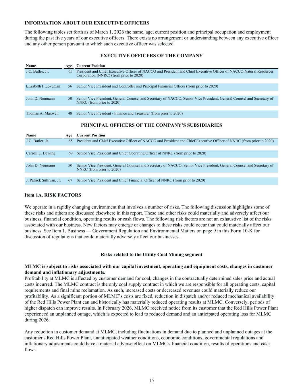 INFORMATION ABOUT OUR EXECUTIVE OFFICERS The following tables set forth as of March 1, 2026 the name, age, current position and principal occupation and employment during the past five years of our executive officers. There exists no arrangement or understanding between any executive officer and any other person pursuant to which such executive officer was selected. EXECUTIVE OFFICERS OF THE COMPANY Name Age Current Position J.C. Butler, Jr. 65 President and Chief Executive Officer of NACCO and President and Chief Executive Officer of NACCO Natural Resources Corporation (NNRC) (from prior to 2020) Elizabeth I. Loveman 56 Senior Vice President and Controller and Principal Financial Officer (from prior to 2020) John D. Neumann 50 Senior Vice President, General Counsel and Secretary of NACCO, Senior Vice President, General Counsel and Secretary of NNRC (from prior to 2020) Thomas A. Maxwell 48 Senior Vice President - Finance and Treasurer (from prior to 2020) PRINCIPAL OFFICERS OF THE COMPANY’S SUBSIDIARIES Name Age Current Position J.C. Butler, Jr. 65 President and Chief Executive Officer of NACCO and President and Chief Executive Officer of NNRC (from prior to 2020) Carroll L. Dewing 69 Senior Vice President and Chief Operating Officer of NNRC (from prior to 2020) John D. Neumann 50 Senior Vice President, General Counsel and Secretary of NACCO, Senior Vice President, General Counsel and Secretary of NNRC (from prior to 2020) J. Patrick Sullivan, Jr. 67 Senior Vice President and Chief Financial Officer of NNRC (from prior to 2020) Item 1A. RISK FACTORS We operate in a rapidly changing environment that involves a number of risks. The following discussion highlights some of these risks and others are discussed elsewhere in this report. These and other risks could materially and adversely affect our business, financial condition, operating results or cash flows. The following risk factors are not an exhaustive list of the risks associated with our business. New factors may emerge or changes to these risks could occur that could materially affect our business. See Item 1. Business — Government Regulation and Environmental Matters on page 9 in this Form 10-K for discussion of regulations that could materially adversely affect our businesses. Risks related to the Utility Coal Mining segment MLMC is subject to risks associated with our capital investment, operating and equipment costs, changes in customer demand and inflationary adjustments. Profitability at MLMC is affected by customer demand for coal, changes in the contractually determined sales price and actual costs incurred. The MLMC contract is the only coal supply contract in which we are responsible for all operating costs, capital requirements and final mine reclamation. As such, increased costs or decreased revenues could materially reduce our profitability. As a significant portion of MLMC’s costs are fixed, reduction in dispatch and/or reduced mechanical availability of the Red Hills Power Plant can and historically has materially reduced operating results at MLMC. Conversely, periods of higher dispatch can improve results. In February 2026, MLMC received notice from its customer that the Red Hills Power Plant experienced an unplanned outage, which is expected to lead to reduced demand and an anticipated operating loss for MLMC during 2026. Any reduction in customer demand at MLMC, including fluctuations in demand due to planned and unplanned outages at the customer's Red Hills Power Plant, unanticipated weather conditions, economic conditions, governmental regulations and inflationary adjustments could have a material adverse effect on MLMC's financial condition, results of operations and cash flows. 15