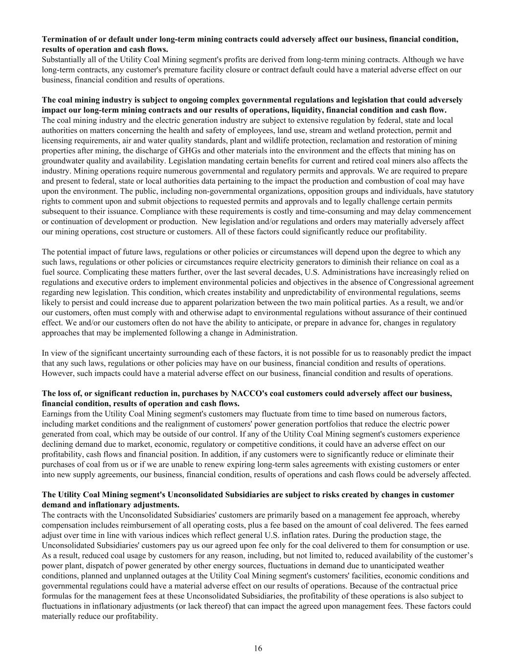 Termination of or default under long-term mining contracts could adversely affect our business, financial condition, results of operation and cash flows. Substantially all of the Utility Coal Mining segment's profits are derived from long-term mining contracts. Although we have long-term contracts, any customer's premature facility closure or contract default could have a material adverse effect on our business, financial condition and results of operations. The coal mining industry is subject to ongoing complex governmental regulations and legislation that could adversely impact our long-term mining contracts and our results of operations, liquidity, financial condition and cash flow. The coal mining industry and the electric generation industry are subject to extensive regulation by federal, state and local authorities on matters concerning the health and safety of employees, land use, stream and wetland protection, permit and licensing requirements, air and water quality standards, plant and wildlife protection, reclamation and restoration of mining properties after mining, the discharge of GHGs and other materials into the environment and the effects that mining has on groundwater quality and availability. Legislation mandating certain benefits for current and retired coal miners also affects the industry. Mining operations require numerous governmental and regulatory permits and approvals. We are required to prepare and present to federal, state or local authorities data pertaining to the impact the production and combustion of coal may have upon the environment. The public, including non-governmental organizations, opposition groups and individuals, have statutory rights to comment upon and submit objections to requested permits and approvals and to legally challenge certain permits subsequent to their issuance. Compliance with these requirements is costly and time-consuming and may delay commencement or continuation of development or production. New legislation and/or regulations and orders may materially adversely affect our mining operations, cost structure or customers. All of these factors could significantly reduce our profitability. The potential impact of future laws, regulations or other policies or circumstances will depend upon the degree to which any such laws, regulations or other policies or circumstances require electricity generators to diminish their reliance on coal as a fuel source. Complicating these matters further, over the last several decades, U.S. Administrations have increasingly relied on regulations and executive orders to implement environmental policies and objectives in the absence of Congressional agreement regarding new legislation. This condition, which creates instability and unpredictability of environmental regulations, seems likely to persist and could increase due to apparent polarization between the two main political parties. As a result, we and/or our customers, often must comply with and otherwise adapt to environmental regulations without assurance of their continued effect. We and/or our customers often do not have the ability to anticipate, or prepare in advance for, changes in regulatory approaches that may be implemented following a change in Administration. In view of the significant uncertainty surrounding each of these factors, it is not possible for us to reasonably predict the impact that any such laws, regulations or other policies may have on our business, financial condition and results of operations. However, such impacts could have a material adverse effect on our business, financial condition and results of operations. The loss of, or significant reduction in, purchases by NACCO's coal customers could adversely affect our business, financial condition, results of operation and cash flows. Earnings from the Utility Coal Mining segment's customers may fluctuate from time to time based on numerous factors, including market conditions and the realignment of customers' power generation portfolios that reduce the electric power generated from coal, which may be outside of our control. If any of the Utility Coal Mining segment's customers experience declining demand due to market, economic, regulatory or competitive conditions, it could have an adverse effect on our profitability, cash flows and financial position. In addition, if any customers were to significantly reduce or eliminate their purchases of coal from us or if we are unable to renew expiring long-term sales agreements with existing customers or enter into new supply agreements, our business, financial condition, results of operations and cash flows could be adversely affected. The Utility Coal Mining segment's Unconsolidated Subsidiaries are subject to risks created by changes in customer demand and inflationary adjustments. The contracts with the Unconsolidated Subsidiaries' customers are primarily based on a management fee approach, whereby compensation includes reimbursement of all operating costs, plus a fee based on the amount of coal delivered. The fees earned adjust over time in line with various indices which reflect general U.S. inflation rates. During the production stage, the Unconsolidated Subsidiaries' customers pay us our agreed upon fee only for the coal delivered to them for consumption or use. As a result, reduced coal usage by customers for any reason, including, but not limited to, reduced availability of the customer’s power plant, dispatch of power generated by other energy sources, fluctuations in demand due to unanticipated weather conditions, planned and unplanned outages at the Utility Coal Mining segment's customers' facilities, economic conditions and governmental regulations could have a material adverse effect on our results of operations. Because of the contractual price formulas for the management fees at these Unconsolidated Subsidiaries, the profitability of these operations is also subject to fluctuations in inflationary adjustments
