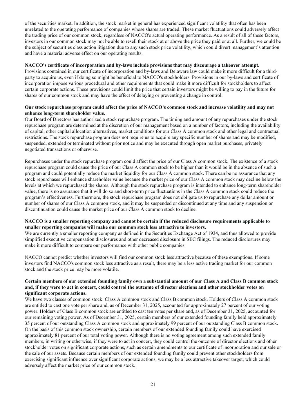 of the securities market. In addition, the stock market in general has experienced significant volatility that often has been unrelated to the operating performance of companies whose shares are traded. These market fluctuations could adversely affect the trading price of our common stock, regardless of NACCO's actual operating performance. As a result of all of these factors, investors in our common stock may not be able to resell their stock at or above the price they paid or at all. Further, we could be the subject of securities class action litigation due to any such stock price volatility, which could divert management’s attention and have a material adverse effect on our operating results. NACCO's certificate of incorporation and by-laws include provisions that may discourage a takeover attempt. Provisions contained in our certificate of incorporation and by-laws and Delaware law could make it more difficult for a third- party to acquire us, even if doing so might be beneficial to NACCO's stockholders. Provisions in our by-laws and certificate of incorporation impose various procedural and other requirements that could make it more difficult for stockholders to affect certain corporate actions. These provisions could limit the price that certain investors might be willing to pay in the future for shares of our common stock and may have the effect of delaying or preventing a change in control. Our stock repurchase program could affect the price of NACCO’s common stock and increase volatility and may not enhance long-term shareholder value. Our Board of Directors has authorized a stock repurchase program. The timing and amount of any repurchases under the stock repurchase program are determined at the discretion of our management based on a number of factors, including the availability of capital, other capital allocation alternatives, market conditions for our Class A common stock and other legal and contractual restrictions. The stock repurchase program does not require us to acquire any specific number of shares and may be modified, suspended, extended or terminated without prior notice and may be executed through open market purchases, privately negotiated transactions or otherwise. Repurchases under the stock repurchase program could affect the price of our Class A common stock. The existence of a stock repurchase program could cause the price of our Class A common stock to be higher than it would be in the absence of such a program and could potentially reduce the market liquidity for our Class A common stock. There can be no assurance that any stock repurchases will enhance shareholder value because the market price of our Class A common stock may decline below the levels at which we repurchased the shares. Although the stock repurchase program is intended to enhance long-term shareholder value, there is no assurance that it will do so and short-term price fluctuations in the Class A common stock could reduce the program’s effectiveness. Furthermore, the stock repurchase program does not obligate us to repurchase any dollar amount or number of shares of our Class A common stock, and it may be suspended or discontinued at any time and any suspension or discontinuation could cause the market price of our Class A common stock to decline. NACCO is a smaller reporting company and cannot be certain if the reduced disclosure requirements applicable to smaller reporting companies will make our common stock less attractive to investors. We are currently a smaller reporting company as defined in the Securities Exchange Act of 1934, and thus allowed to provide simplified executive compensation disclosures and other decreased disclosure in SEC filings. The reduced disclosures may make it more difficult to compare our performance with other public companies. NACCO cannot predict whether investors will find our common stock less attractive because of these exemptions. If some investors find NACCO's common stock less attractive as a result, there may be a less active trading market for our common stock and the stock price may be more volatile. Certain members of our extended founding family own a substantial amount of our Class A and Class B common stock and, if they were to act in concert, could control the outcome of director elections and other stockholder votes on significant corporate actions. We have two classes of common stock: Class A common stock and Class B common stock. Holders of Class A common stock are entitled to cast one vote per share and, as of December 31, 2025, accounted for approximately 27 percent of our voting power. Holders of Class B common stock are entitled to cast ten votes per share and, as of December 31, 2025, accounted for our remaining voting power. As of December 31, 2025, certain members of our extended founding family held approximately 35 percent of our outstanding Class A common stock and approximately 99 percent of our outstanding Class B common stock. On the basis of this common stock ownership, certain members of our extended founding family could have exercised approximately 81 percent of our total voting power. Although there is no voting agreement among such extended family members, in writing or otherwise, if they were to act in concert, they could control the outcome of director elections and other stockholder votes on significant corporate actions, such as certain amendments to our certificate of incorporation and our sale or the sale of our assets. Because certain members of our extended founding family could prevent other stockholders from exercising significant influence over significant corporate actions, we may be a less attractive takeover target, which could adversely affect the market price of our common stock. 21