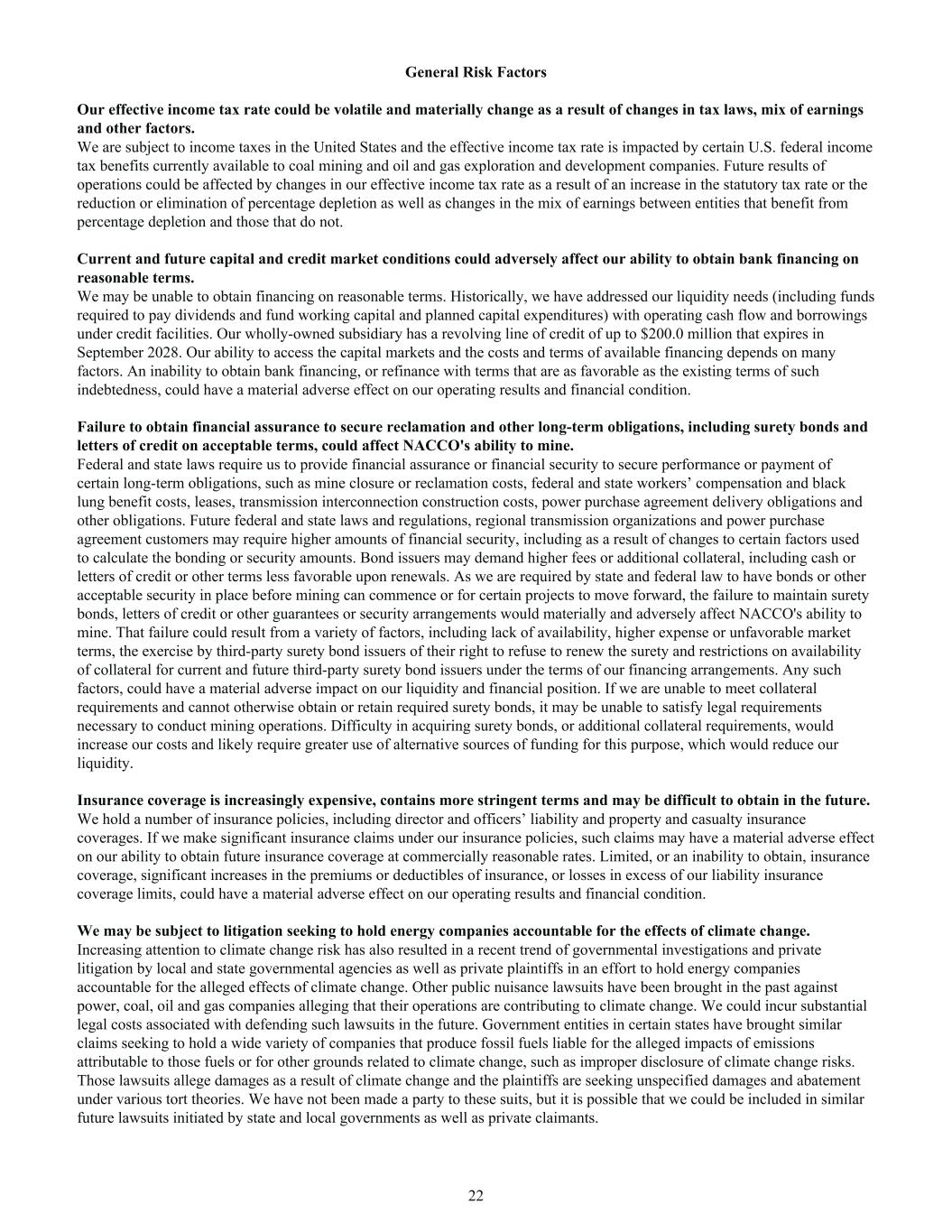 General Risk Factors Our effective income tax rate could be volatile and materially change as a result of changes in tax laws, mix of earnings and other factors. We are subject to income taxes in the United States and the effective income tax rate is impacted by certain U.S. federal income tax benefits currently available to coal mining and oil and gas exploration and development companies. Future results of operations could be affected by changes in our effective income tax rate as a result of an increase in the statutory tax rate or the reduction or elimination of percentage depletion as well as changes in the mix of earnings between entities that benefit from percentage depletion and those that do not. Current and future capital and credit market conditions could adversely affect our ability to obtain bank financing on reasonable terms. We may be unable to obtain financing on reasonable terms. Historically, we have addressed our liquidity needs (including funds required to pay dividends and fund working capital and planned capital expenditures) with operating cash flow and borrowings under credit facilities. Our wholly-owned subsidiary has a revolving line of credit of up to $200.0 million that expires in September 2028. Our ability to access the capital markets and the costs and terms of available financing depends on many factors. An inability to obtain bank financing, or refinance with terms that are as favorable as the existing terms of such indebtedness, could have a material adverse effect on our operating results and financial condition. Failure to obtain financial assurance to secure reclamation and other long-term obligations, including surety bonds and letters of credit on acceptable terms, could affect NACCO's ability to mine. Federal and state laws require us to provide financial assurance or financial security to secure performance or payment of certain long-term obligations, such as mine closure or reclamation costs, federal and state workers’ compensation and black lung benefit costs, leases, transmission interconnection construction costs, power purchase agreement delivery obligations and other obligations. Future federal and state laws and regulations, regional transmission organizations and power purchase agreement customers may require higher amounts of financial security, including as a result of changes to certain factors used to calculate the bonding or security amounts. Bond issuers may demand higher fees or additional collateral, including cash or letters of credit or other terms less favorable upon renewals. As we are required by state and federal law to have bonds or other acceptable security in place before mining can commence or for certain projects to move forward, the failure to maintain surety bonds, letters of credit or other guarantees or security arrangements would materially and adversely affect NACCO's ability to mine. That failure could result from a variety of factors, including lack of availability, higher expense or unfavorable market terms, the exercise by third-party surety bond issuers of their right to refuse to renew the surety and restrictions on availability of collateral for current and future third-party surety bond issuers under the terms of our financing arrangements. Any such factors, could have a material adverse impact on our liquidity and financial position. If we are unable to meet collateral requirements and cannot otherwise obtain or retain required surety bonds, it may be unable to satisfy legal requirements necessary to conduct mining operations. Difficulty in acquiring surety bonds, or additional collateral requirements, would increase our costs and likely require greater use of alternative sources of funding for this purpose, which would reduce our liquidity. Insurance coverage is increasingly expensive, contains more stringent terms and may be difficult to obtain in the future. We hold a number of insurance policies, including director and officers’ liability and property and casualty insurance coverages. If we make significant insurance claims under our insurance policies, such claims may have a material adverse effect on our ability to obtain future insurance coverage at commercially reasonable rates. Limited, or an inability to obtain, insurance coverage, significant increases in the premiums or deductibles of insurance, or losses in excess of our liability insurance coverage limits, could have a material adverse effect on our operating results and financial condition. We may be subject to litigation seeking to hold energy companies accountable for the effects of climate change. Increasing attention to climate change risk has also resulted in a recent trend of governmental investigations and private litigation by local and state governmental agencies as well as private plaintiffs in an effort to hold energy companies accountable for the alleged effects of climate change. Other public nuisance lawsuits have been brought in the past against power, coal, oil and gas companies alleging that their operations are contributing to climate change. We could incur substantial legal costs associated with defending such lawsuits in the future. Government entities in certain states have brought similar claims seeking to hold a wide variety of companies that produce fossil fuels liable for the alleged impacts of emissions attributable to those fuels or for other grounds related to climate change, such as improper disclosure of climate change risks. Those lawsuits allege damages as a result of climate change and the plaintiffs are seeking unspecified damages and abatement under various tort theories. We have not been made a party to these suits, but it is possible that we could be included in similar future lawsuits initiated by state and local governments as well as private claimants. 22