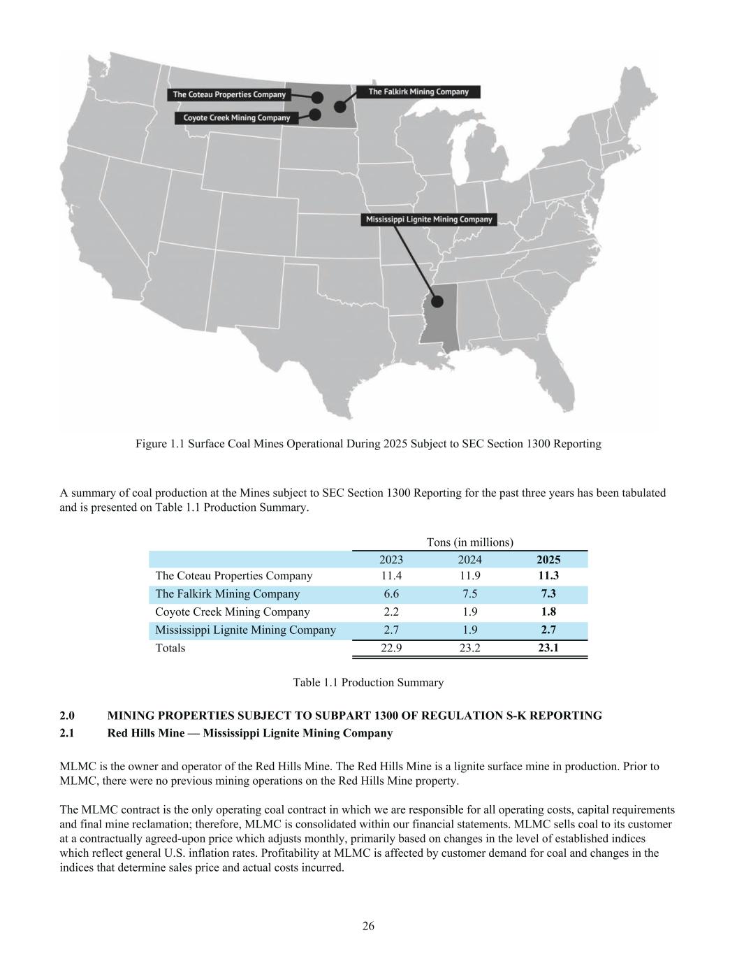Figure 1.1 Surface Coal Mines Operational During 2025 Subject to SEC Section 1300 Reporting A summary of coal production at the Mines subject to SEC Section 1300 Reporting for the past three years has been tabulated and is presented on Table 1.1 Production Summary. Tons (in millions) 2023 2024 2025 The Coteau Properties Company 11.4 11.9 11.3 The Falkirk Mining Company 6.6 7.5 7.3 Coyote Creek Mining Company 2.2 1.9 1.8 Mississippi Lignite Mining Company 2.7 1.9 2.7 Totals 22.9 23.2 23.1 Table 1.1 Production Summary 2.0 MINING PROPERTIES SUBJECT TO SUBPART 1300 OF REGULATION S-K REPORTING 2.1 Red Hills Mine — Mississippi Lignite Mining Company MLMC is the owner and operator of the Red Hills Mine. The Red Hills Mine is a lignite surface mine in production. Prior to MLMC, there were no previous mining operations on the Red Hills Mine property. The MLMC contract is the only operating coal contract in which we are responsible for all operating costs, capital requirements and final mine reclamation; therefore, MLMC is consolidated within our financial statements. MLMC sells coal to its customer at a contractually agreed-upon price which adjusts monthly, primarily based on changes in the level of established indices which reflect general U.S. inflation rates. Profitability at MLMC is affected by customer demand for coal and changes in the indices that determine sales price and actual costs incurred. 26