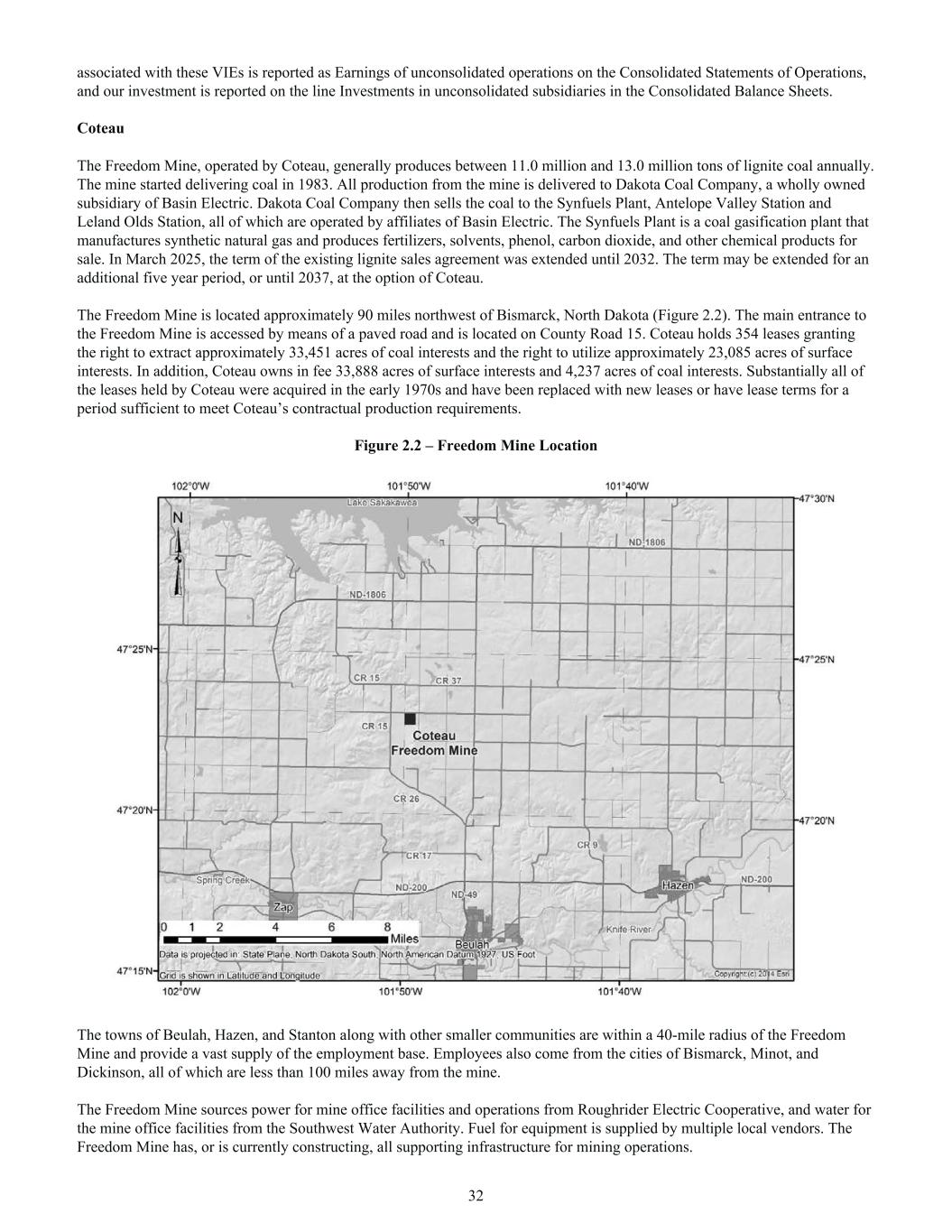 associated with these VIEs is reported as Earnings of unconsolidated operations on the Consolidated Statements of Operations, and our investment is reported on the line Investments in unconsolidated subsidiaries in the Consolidated Balance Sheets. Coteau The Freedom Mine, operated by Coteau, generally produces between 11.0 million and 13.0 million tons of lignite coal annually. The mine started delivering coal in 1983. All production from the mine is delivered to Dakota Coal Company, a wholly owned subsidiary of Basin Electric. Dakota Coal Company then sells the coal to the Synfuels Plant, Antelope Valley Station and Leland Olds Station, all of which are operated by affiliates of Basin Electric. The Synfuels Plant is a coal gasification plant that manufactures synthetic natural gas and produces fertilizers, solvents, phenol, carbon dioxide, and other chemical products for sale. In March 2025, the term of the existing lignite sales agreement was extended until 2032. The term may be extended for an additional five year period, or until 2037, at the option of Coteau. The Freedom Mine is located approximately 90 miles northwest of Bismarck, North Dakota (Figure 2.2). The main entrance to the Freedom Mine is accessed by means of a paved road and is located on County Road 15. Coteau holds 354 leases granting the right to extract approximately 33,451 acres of coal interests and the right to utilize approximately 23,085 acres of surface interests. In addition, Coteau owns in fee 33,888 acres of surface interests and 4,237 acres of coal interests. Substantially all of the leases held by Coteau were acquired in the early 1970s and have been replaced with new leases or have lease terms for a period sufficient to meet Coteau’s contractual production requirements. Figure 2.2 – Freedom Mine Location The towns of Beulah, Hazen, and Stanton along with other smaller communities are within a 40-mile radius of the Freedom Mine and provide a vast supply of the employment base. Employees also come from the cities of Bismarck, Minot, and Dickinson, all of which are less than 100 miles away from the mine. The Freedom Mine sources power for mine office facilities and operations from Roughrider Electric Cooperative, and water for the mine office facilities from the Southwest Water Authority. Fuel for equipment is supplied by multiple local vendors. The Freedom Mine has, or is currently constructing, all supporting infrastructure for mining operations. 32