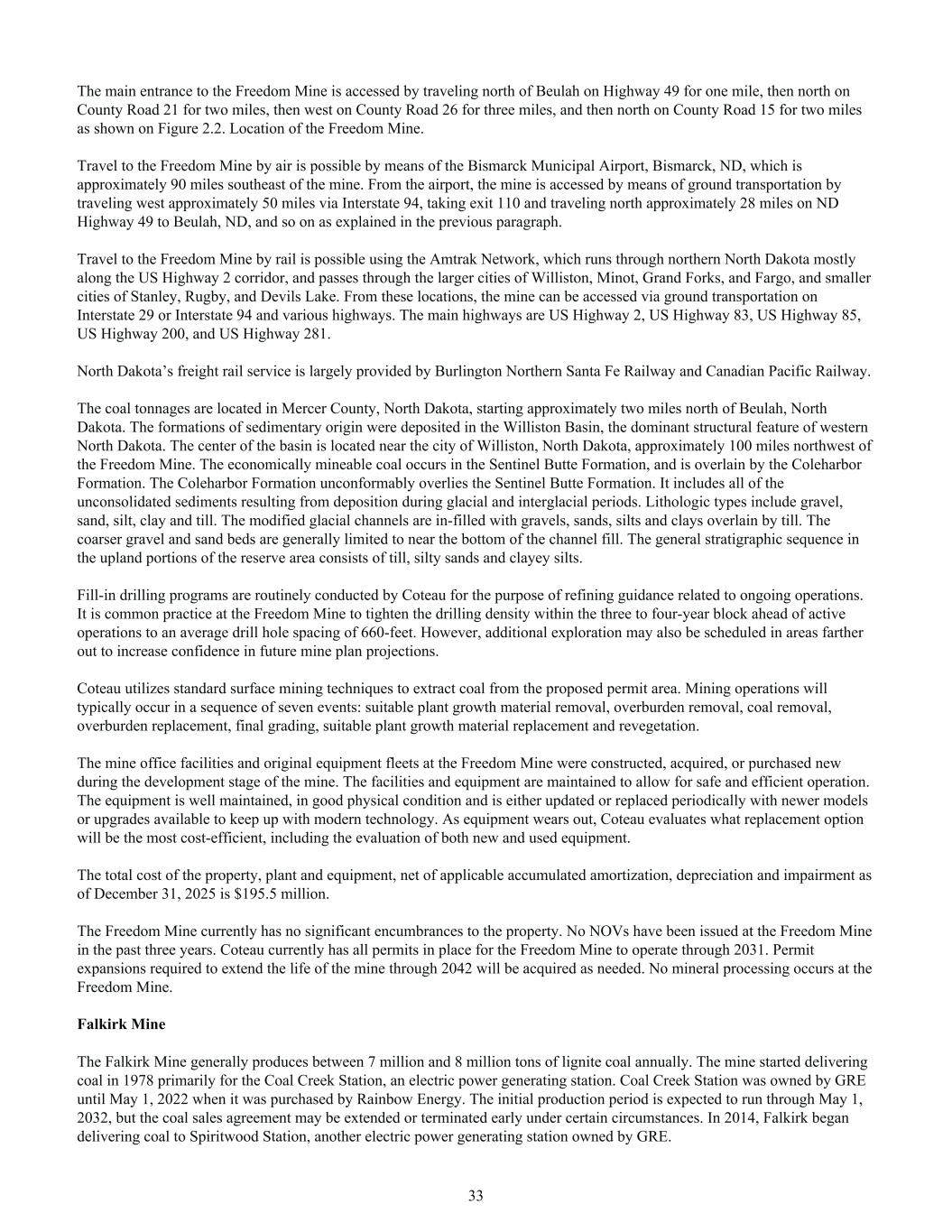The main entrance to the Freedom Mine is accessed by traveling north of Beulah on Highway 49 for one mile, then north on County Road 21 for two miles, then west on County Road 26 for three miles, and then north on County Road 15 for two miles as shown on Figure 2.2. Location of the Freedom Mine. Travel to the Freedom Mine by air is possible by means of the Bismarck Municipal Airport, Bismarck, ND, which is approximately 90 miles southeast of the mine. From the airport, the mine is accessed by means of ground transportation by traveling west approximately 50 miles via Interstate 94, taking exit 110 and traveling north approximately 28 miles on ND Highway 49 to Beulah, ND, and so on as explained in the previous paragraph. Travel to the Freedom Mine by rail is possible using the Amtrak Network, which runs through northern North Dakota mostly along the US Highway 2 corridor, and passes through the larger cities of Williston, Minot, Grand Forks, and Fargo, and smaller cities of Stanley, Rugby, and Devils Lake. From these locations, the mine can be accessed via ground transportation on Interstate 29 or Interstate 94 and various highways. The main highways are US Highway 2, US Highway 83, US Highway 85, US Highway 200, and US Highway 281. North Dakota’s freight rail service is largely provided by Burlington Northern Santa Fe Railway and Canadian Pacific Railway. The coal tonnages are located in Mercer County, North Dakota, starting approximately two miles north of Beulah, North Dakota. The formations of sedimentary origin were deposited in the Williston Basin, the dominant structural feature of western North Dakota. The center of the basin is located near the city of Williston, North Dakota, approximately 100 miles northwest of the Freedom Mine. The economically mineable coal occurs in the Sentinel Butte Formation, and is overlain by the Coleharbor Formation. The Coleharbor Formation unconformably overlies the Sentinel Butte Formation. It includes all of the unconsolidated sediments resulting from deposition during glacial and interglacial periods. Lithologic types include gravel, sand, silt, clay and till. The modified glacial channels are in-filled with gravels, sands, silts and clays overlain by till. The coarser gravel and sand beds are generally limited to near the bottom of the channel fill. The general stratigraphic sequence in the upland portions of the reserve area consists of till, silty sands and clayey silts. Fill-in drilling programs are routinely conducted by Coteau for the purpose of refining guidance related to ongoing operations. It is common practice at the Freedom Mine to tighten the drilling density within the three to four-year block ahead of active operations to an average drill hole spacing of 660-feet. However, additional exploration may also be scheduled in areas farther out to increase confidence in future mine plan projections. Coteau utilizes standard surface mining techniques to extract coal from the proposed permit area. Mining operations will typically occur in a sequence of seven events: suitable plant growth material removal, overburden removal, coal removal, overburden replacement, final grading, suitable plant growth material replacement and revegetation. The mine office facilities and original equipment fleets at the Freedom Mine were constructed, acquired, or purchased new during the development stage of the mine. The facilities and equipment are maintained to allow for safe and efficient operation. The equipment is well maintained, in good physical condition and is either updated or replaced periodically with newer models or upgrades available to keep up with modern technology. As equipment wears out, Coteau evaluates what replacement option will be the most cost-efficient, including the evaluation of both new and used equipment. The total cost of the property, plant and equipment, net of applicable accumulated amortization, depreciation and impairment as of December 31, 2025 is $195.5 million. The Freedom Mine currently has no significant encumbrances to the property. No NOVs have been issued at the Freedom Mine in the past three years. Coteau currently has all permits in place for the Freedom Mine to operate through 2031. Permit expansions required to extend the life of the mine through 2042 will be acquired as needed. No mineral processing occurs at the Freedom Mine. Falkirk Mine The Falkirk Mine generally produces between 7 million and 8 million tons of lignite coal annually. The mine started delivering coal in 1978 primarily for the Coal Creek Station, an electric power generating station. Coal Creek Station was owned by GRE until May 1, 2022 when it was purchased by Rainbow Energy. The initial production period is expected to run through May 1, 2032, but the coal sales agreement may be extended or terminated early under certain circumstances. In 2014, Falkirk began delivering coal to Spiritwood Station, another electric power generating station owned by GRE. 33