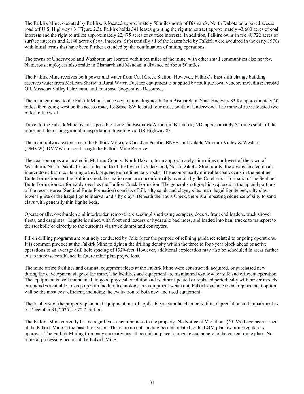 The Falkirk Mine, operated by Falkirk, is located approximately 50 miles north of Bismarck, North Dakota on a paved access road off U.S. Highway 83 (Figure 2.3). Falkirk holds 341 leases granting the right to extract approximately 43,600 acres of coal interests and the right to utilize approximately 22,475 acres of surface interests. In addition, Falkirk owns in fee 40,722 acres of surface interests and 2,148 acres of coal interests. Substantially all of the leases held by Falkirk were acquired in the early 1970s with initial terms that have been further extended by the continuation of mining operations. The towns of Underwood and Washburn are located within ten miles of the mine, with other small communities also nearby. Numerous employees also reside in Bismarck and Mandan, a distance of about 50 miles. The Falkirk Mine receives both power and water from Coal Creek Station. However, Falkirk’s East shift change building receives water from McLean-Sheridan Rural Water. Fuel for equipment is supplied by multiple local vendors including: Farstad Oil, Missouri Valley Petroleum, and Enerbase Cooperative Resources. The main entrance to the Falkirk Mine is accessed by traveling north from Bismarck on State Highway 83 for approximately 50 miles, then going west on the access road, 1st Street SW located four miles south of Underwood. The mine office is located two miles to the west. Travel to the Falkirk Mine by air is possible using the Bismarck Airport in Bismarck, ND, approximately 55 miles south of the mine, and then using ground transportation, traveling via US Highway 83. The main railway systems near the Falkirk Mine are Canadian Pacific, BNSF, and Dakota Missouri Valley & Western (DMVW). DMVW crosses through the Falkirk Mine Reserve. The coal tonnages are located in McLean County, North Dakota, from approximately nine miles northwest of the town of Washburn, North Dakota to four miles north of the town of Underwood, North Dakota. Structurally, the area is located on an intercratonic basin containing a thick sequence of sedimentary rocks. The economically mineable coal occurs in the Sentinel Butte Formation and the Bullion Creek Formation and are unconformably overlain by the Coleharbor Formation. The Sentinel Butte Formation conformably overlies the Bullion Creek Formation. The general stratigraphic sequence in the upland portions of the reserve area (Sentinel Butte Formation) consists of till, silty sands and clayey silts, main hagel lignite bed, silty clay, lower lignite of the hagel lignite interval and silty clays. Beneath the Tavis Creek, there is a repeating sequence of silty to sand clays with generally thin lignite beds. Operationally, overburden and interburden removal are accomplished using scrapers, dozers, front end loaders, truck shovel fleets, and draglines. Lignite is mined with front end loaders or hydraulic backhoes, and loaded into haul trucks to transport to the stockpile or directly to the customer via truck dumps and conveyors. Fill-in drilling programs are routinely conducted by Falkirk for the purpose of refining guidance related to ongoing operations. It is common practice at the Falkirk Mine to tighten the drilling density within the three to four-year block ahead of active operations to an average drill hole spacing of 1320-feet. However, additional exploration may also be scheduled in areas farther out to increase confidence in future mine plan projections. The mine office facilities and original equipment fleets at the Falkirk Mine were constructed, acquired, or purchased new during the development stage of the mine. The facilities and equipment are maintained to allow for safe and efficient operation. The equipment is well maintained, in good physical condition and is either updated or replaced periodically with newer models or upgrades available to keep up with modern technology. As equipment wears out, Falkirk evaluates what replacement option will be the most cost-efficient, including the evaluation of both new and used equipment. The total cost of the property, plant and equipment, net of applicable accumulated amortization, depreciation and impairment as of December 31, 2025 is $70.7 million. The Falkirk Mine currently has no significant encumbrances to the property. No Notice of Violations (NOVs) have been issued at the Falkirk Mine in the past three years. There are no outstanding permits related to the LOM plan awaiting regulatory approval. The Falkirk Mining Company currently has all permits in place to operate and adhere to the current mine plan. No mineral processing occurs at the Falkirk Mine. 34