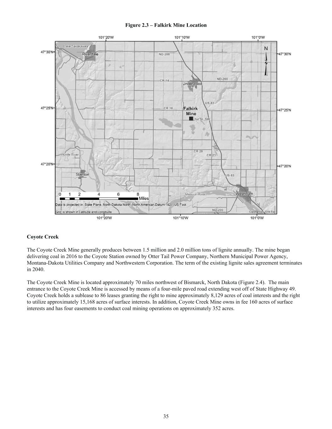 Figure 2.3 – Falkirk Mine Location Coyote Creek The Coyote Creek Mine generally produces between 1.5 million and 2.0 million tons of lignite annually. The mine began delivering coal in 2016 to the Coyote Station owned by Otter Tail Power Company, Northern Municipal Power Agency, Montana-Dakota Utilities Company and Northwestern Corporation. The term of the existing lignite sales agreement terminates in 2040. The Coyote Creek Mine is located approximately 70 miles northwest of Bismarck, North Dakota (Figure 2.4). The main entrance to the Coyote Creek Mine is accessed by means of a four-mile paved road extending west off of State Highway 49. Coyote Creek holds a sublease to 86 leases granting the right to mine approximately 8,129 acres of coal interests and the right to utilize approximately 15,168 acres of surface interests. In addition, Coyote Creek Mine owns in fee 160 acres of surface interests and has four easements to conduct coal mining operations on approximately 352 acres. 35