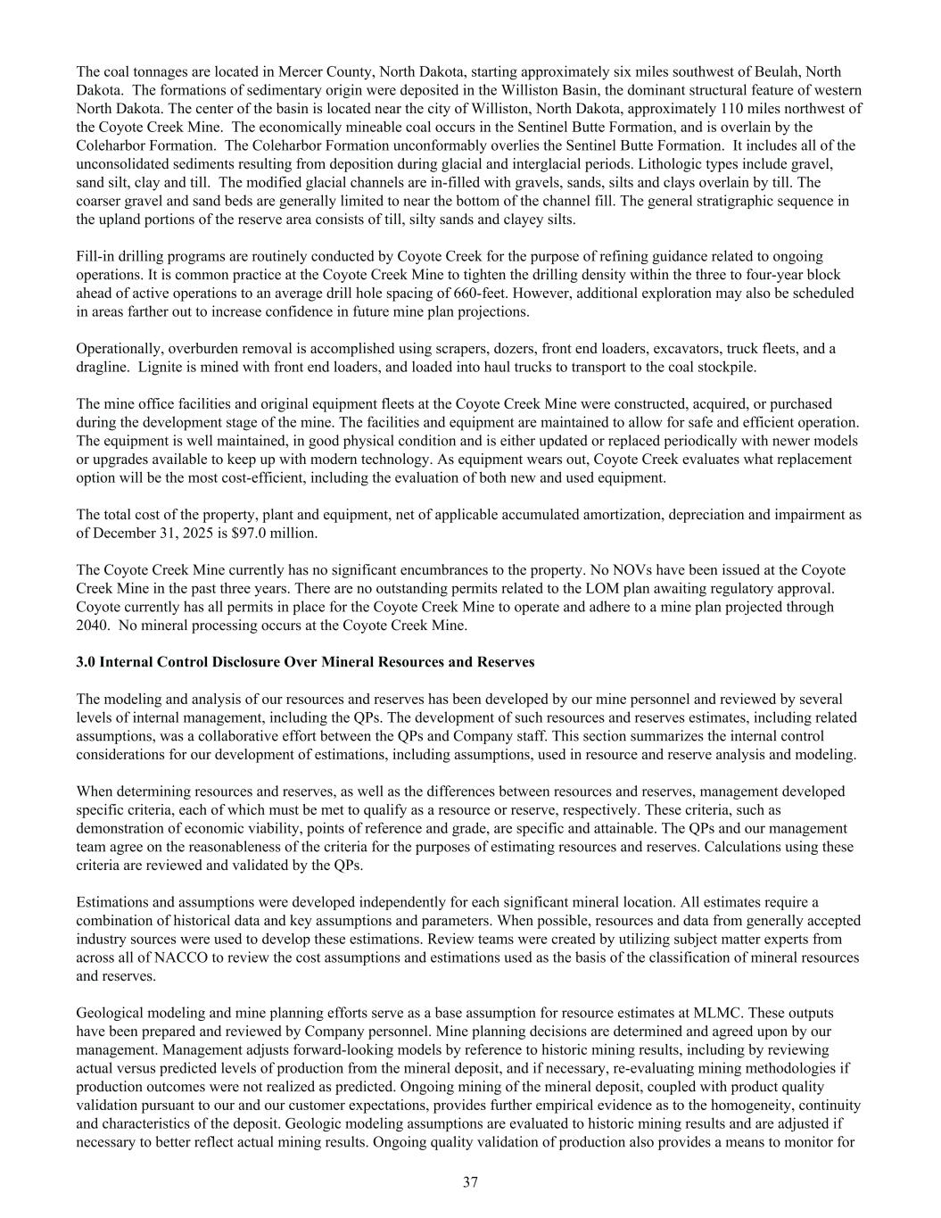 The coal tonnages are located in Mercer County, North Dakota, starting approximately six miles southwest of Beulah, North Dakota. The formations of sedimentary origin were deposited in the Williston Basin, the dominant structural feature of western North Dakota. The center of the basin is located near the city of Williston, North Dakota, approximately 110 miles northwest of the Coyote Creek Mine. The economically mineable coal occurs in the Sentinel Butte Formation, and is overlain by the Coleharbor Formation. The Coleharbor Formation unconformably overlies the Sentinel Butte Formation. It includes all of the unconsolidated sediments resulting from deposition during glacial and interglacial periods. Lithologic types include gravel, sand silt, clay and till. The modified glacial channels are in-filled with gravels, sands, silts and clays overlain by till. The coarser gravel and sand beds are generally limited to near the bottom of the channel fill. The general stratigraphic sequence in the upland portions of the reserve area consists of till, silty sands and clayey silts. Fill-in drilling programs are routinely conducted by Coyote Creek for the purpose of refining guidance related to ongoing operations. It is common practice at the Coyote Creek Mine to tighten the drilling density within the three to four-year block ahead of active operations to an average drill hole spacing of 660-feet. However, additional exploration may also be scheduled in areas farther out to increase confidence in future mine plan projections. Operationally, overburden removal is accomplished using scrapers, dozers, front end loaders, excavators, truck fleets, and a dragline. Lignite is mined with front end loaders, and loaded into haul trucks to transport to the coal stockpile. The mine office facilities and original equipment fleets at the Coyote Creek Mine were constructed, acquired, or purchased during the development stage of the mine. The facilities and equipment are maintained to allow for safe and efficient operation. The equipment is well maintained, in good physical condition and is either updated or replaced periodically with newer models or upgrades available to keep up with modern technology. As equipment wears out, Coyote Creek evaluates what replacement option will be the most cost-efficient, including the evaluation of both new and used equipment. The total cost of the property, plant and equipment, net of applicable accumulated amortization, depreciation and impairment as of December 31, 2025 is $97.0 million. The Coyote Creek Mine currently has no significant encumbrances to the property. No NOVs have been issued at the Coyote Creek Mine in the past three years. There are no outstanding permits related to the LOM plan awaiting regulatory approval. Coyote currently has all permits in place for the Coyote Creek Mine to operate and adhere to a mine plan projected through 2040. No mineral processing occurs at the Coyote Creek Mine. 3.0 Internal Control Disclosure Over Mineral Resources and Reserves The modeling and analysis of our resources and reserves has been developed by our mine personnel and reviewed by several levels of internal management, including the QPs. The development of such resources and reserves estimates, including related assumptions, was a collaborative effort between the QPs and Company staff. This section summarizes the internal control considerations for our development of estimations, including assumptions, used in resource and reserve analysis and modeling. When determining resources and reserves, as well as the differences between resources and reserves, management developed specific criteria, each of which must be met to qualify as a resource or reserve, respectively. These criteria, such as demonstration of economic viability, points of reference and grade, are specific and attainable. The QPs and our management team agree on the reasonableness of the criteria for the purposes of estimating resources and reserves. Calculations using these criteria are reviewed and validated by the QPs. Estimations and assumptions were developed independently for each significant mineral location. All estimates require a combination of historical data and key assumptions and parameters. When possible, resources and data from generally accepted industry sources were used to develop these estimations. Review teams were created by utilizing subject matter experts from across all of NACCO to review the cost assumptions and estimations used as the basis of the classification of mineral resources and reserves. Geological modeling and mine planning efforts serve as a base assumption for resource estimates at MLMC. These outputs have been prepared and reviewed by Company personnel. Mine planning decisions are determined and agreed upon by our management. Management adjusts forward-looking models by reference to historic mining results, including by reviewing actual versus predicted levels of production from the mineral deposit, and if necessary, re-evaluating mining methodologies if production outcomes were not realized as predicted. Ongoing mining of the mineral deposit, coupled with product quality validation pursuant to our and our customer expectations, provides further empirical evidence as to the homogeneity, continuity and characteristics of the deposit. Geologic modeling assumptions are evaluated to historic mining results and are adjusted if necessary to better reflect actual mining results. Ongoing quality validation of production also provides a means to monitor for 37