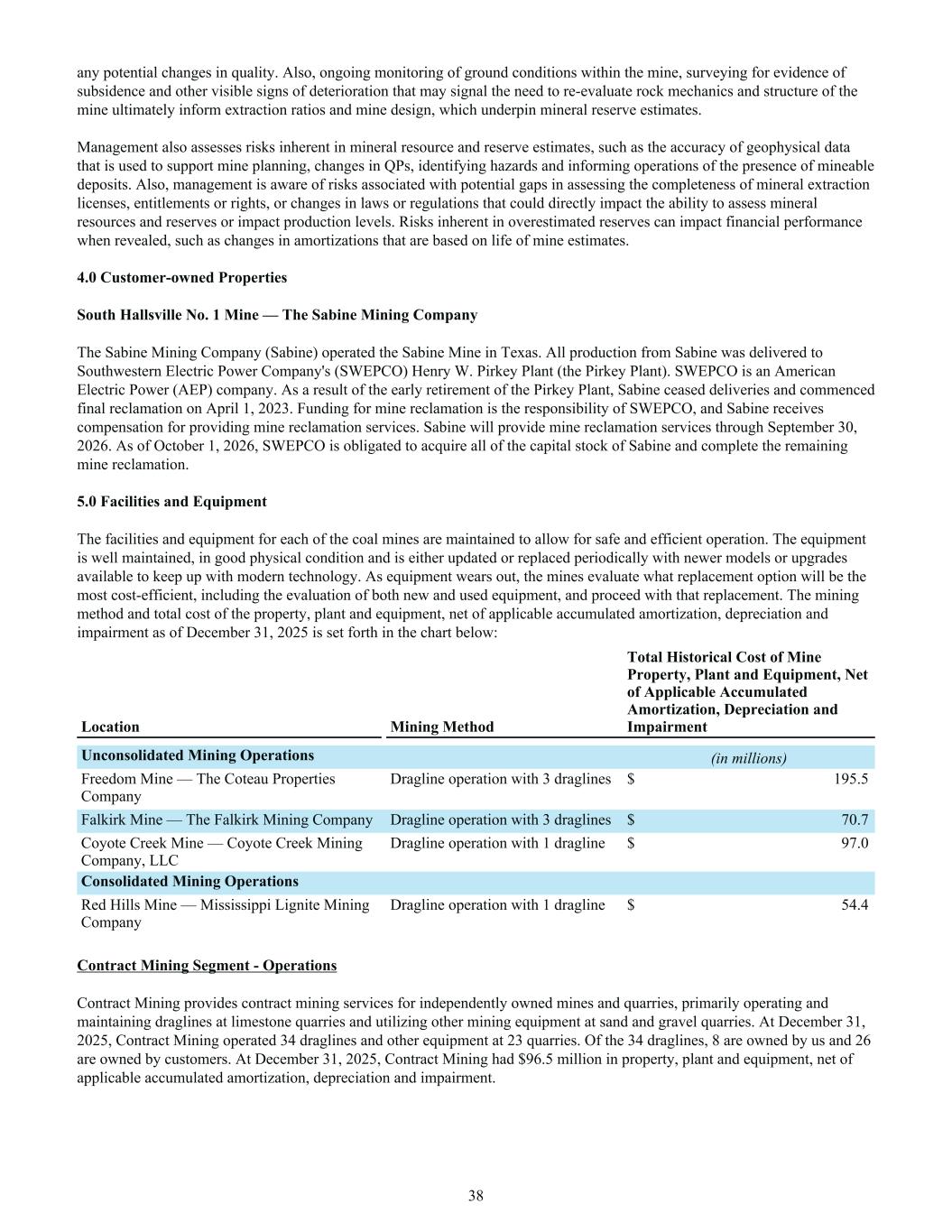 any potential changes in quality. Also, ongoing monitoring of ground conditions within the mine, surveying for evidence of subsidence and other visible signs of deterioration that may signal the need to re-evaluate rock mechanics and structure of the mine ultimately inform extraction ratios and mine design, which underpin mineral reserve estimates. Management also assesses risks inherent in mineral resource and reserve estimates, such as the accuracy of geophysical data that is used to support mine planning, changes in QPs, identifying hazards and informing operations of the presence of mineable deposits. Also, management is aware of risks associated with potential gaps in assessing the completeness of mineral extraction licenses, entitlements or rights, or changes in laws or regulations that could directly impact the ability to assess mineral resources and reserves or impact production levels. Risks inherent in overestimated reserves can impact financial performance when revealed, such as changes in amortizations that are based on life of mine estimates. 4.0 Customer-owned Properties South Hallsville No. 1 Mine — The Sabine Mining Company The Sabine Mining Company (Sabine) operated the Sabine Mine in Texas. All production from Sabine was delivered to Southwestern Electric Power Company's (SWEPCO) Henry W. Pirkey Plant (the Pirkey Plant). SWEPCO is an American Electric Power (AEP) company. As a result of the early retirement of the Pirkey Plant, Sabine ceased deliveries and commenced final reclamation on April 1, 2023. Funding for mine reclamation is the responsibility of SWEPCO, and Sabine receives compensation for providing mine reclamation services. Sabine will provide mine reclamation services through September 30, 2026. As of October 1, 2026, SWEPCO is obligated to acquire all of the capital stock of Sabine and complete the remaining mine reclamation. 5.0 Facilities and Equipment The facilities and equipment for each of the coal mines are maintained to allow for safe and efficient operation. The equipment is well maintained, in good physical condition and is either updated or replaced periodically with newer models or upgrades available to keep up with modern technology. As equipment wears out, the mines evaluate what replacement option will be the most cost-efficient, including the evaluation of both new and used equipment, and proceed with that replacement. The mining method and total cost of the property, plant and equipment, net of applicable accumulated amortization, depreciation and impairment as of December 31, 2025 is set forth in the chart below: Location Mining Method Total Historical Cost of Mine Property, Plant and Equipment, Net of Applicable Accumulated Amortization, Depreciation and Impairment Unconsolidated Mining Operations (in millions) Freedom Mine — The Coteau Properties Company Dragline operation with 3 draglines $ 195.5 Falkirk Mine — The Falkirk Mining Company Dragline operation with 3 draglines $ 70.7 Coyote Creek Mine — Coyote Creek Mining Company, LLC Dragline operation with 1 dragline $ 97.0 Consolidated Mining Operations Red Hills Mine — Mississippi Lignite Mining Company Dragline operation with 1 dragline $ 54.4 Contract Mining Segment - Operations Contract Mining provides contract mining services for independently owned mines and quarries, primarily operating and maintaining draglines at limestone quarries and utilizing other mining equipment at sand and gravel quarries. At December 31, 2025, Contract Mining operated 34 draglines and other equipment at 23 quarries. Of the 34 draglines, 8 are owned by us and 26 are owned by customers. At December 31, 2025, Contract Mining had $96.5 million in property, plant and equipment, net of applicable accumulated amortization, depreciation and impairment. 38
