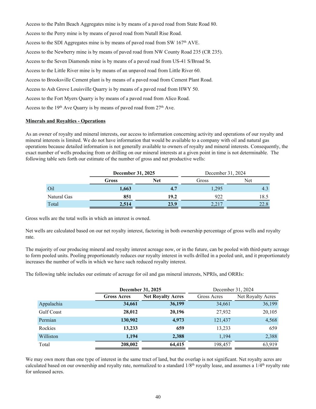 Access to the Palm Beach Aggregates mine is by means of a paved road from State Road 80. Access to the Perry mine is by means of paved road from Nutall Rise Road. Access to the SDI Aggregates mine is by means of paved road from SW 167th AVE. Access to the Newberry mine is by means of paved road from NW County Road 235 (CR 235). Access to the Seven Diamonds mine is by means of a paved road from US-41 S/Broad St. Access to the Little River mine is by means of an unpaved road from Little River 60. Access to Brooksville Cement plant is by means of a paved road from Cement Plant Road. Access to Ash Grove Louisville Quarry is by means of a paved road from HWY 50. Access to the Fort Myers Quarry is by means of a paved road from Alico Road. Access to the 19th Ave Quarry is by means of paved road from 27th Ave. Minerals and Royalties - Operations As an owner of royalty and mineral interests, our access to information concerning activity and operations of our royalty and mineral interests is limited. We do not have information that would be available to a company with oil and natural gas operations because detailed information is not generally available to owners of royalty and mineral interests. Consequently, the exact number of wells producing from or drilling on our mineral interests at a given point in time is not determinable. The following table sets forth our estimate of the number of gross and net productive wells: December 31, 2025 December 31, 2024 Gross Net Gross Net Oil 1,663 4.7 1,295 4.3 Natural Gas 851 19.2 922 18.5 Total 2,514 23.9 2,217 22.8 Gross wells are the total wells in which an interest is owned. Net wells are calculated based on our net royalty interest, factoring in both ownership percentage of gross wells and royalty rate. The majority of our producing mineral and royalty interest acreage now, or in the future, can be pooled with third-party acreage to form pooled units. Pooling proportionately reduces our royalty interest in wells drilled in a pooled unit, and it proportionately increases the number of wells in which we have such reduced royalty interest. The following table includes our estimate of acreage for oil and gas mineral interests, NPRIs, and ORRIs: December 31, 2025 December 31, 2024 Gross Acres Net Royalty Acres Gross Acres Net Royalty Acres Appalachia 34,661 36,199 34,661 36,199 Gulf Coast 28,012 20,196 27,932 20,105 Permian 130,902 4,973 121,437 4,568 Rockies 13,233 659 13,233 659 Williston 1,194 2,388 1,194 2,388 Total 208,002 64,415 198,457 63,919 We may own more than one type of interest in the same tract of land, but the overlap is not significant. Net royalty acres are calculated based on our ownership and royalty rate, normalized to a standard 1/8th royalty lease, and assumes a 1/4th royalty rate for unleased acres. 40