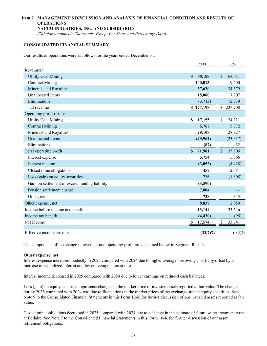 CONSOLIDATED FINANCIAL SUMMARY Our results of operations were as follows for the years ended December 31: 2025 2024 Revenues: Utility Coal Mining $ 88,188 $ 68,611 Contract Mining 140,013 119,600 Minerals and Royalties 37,630 34,579 Unallocated Items 15,080 17,707 Eliminations (3,713) (2,789) Total revenue $ 277,198 $ 237,708 Operating profit (loss): Utility Coal Mining $ 17,155 $ 24,311 Contract Mining 5,767 5,772 Minerals and Royalties 29,108 28,927 Unallocated Items (29,962) (23,317) Eliminations (87) 12 Total operating profit $ 21,981 $ 35,705 Interest expense 5,754 5,566 Interest income (3,052) (4,428) Closed mine obligations 457 2,381 Loss (gain) on equity securities 726 (1,805) Gain on settlement of excess funding liability (3,590) — Pension settlement charge 7,804 — Other, net 738 345 Other expense, net 8,837 2,059 Income before income tax benefit 13,144 33,646 Income tax benefit (4,430) (95) Net income $ 17,574 $ 33,741 Effective income tax rate (33.7) % (0.3) % The components of the change in revenues and operating profit are discussed below in Segment Results. Other expense, net Interest expense increased modestly in 2025 compared with 2024 due to higher average borrowings, partially offset by an increase in capitalized interest and lower average interest rates. Interest income decreased in 2025 compared with 2024 due to lower earnings on reduced cash balances. Loss (gain) on equity securities represents changes in the market price of invested assets reported at fair value. The change during 2025 compared with 2024 was due to fluctuations in the market prices of the exchange-traded equity securities. See Note 9 to the Consolidated Financial Statements in this Form 10-K for further discussion of our invested assets reported at fair value. Closed mine obligations decreased in 2025 compared with 2024 due to a change in the estimate of future water treatment costs at Bellaire. See Note 7 to the Consolidated Financial Statements in this Form 10-K for further discussion of our asset retirement obligations. Item 7. MANAGEMENT'S DISCUSSION AND ANALYSIS OF FINANCIAL CONDITION AND RESULTS OF OPERATIONS NACCO INDUSTRIES, INC. AND SUBSIDIARIES (Tabular Amounts in Thousands, Except Per Share and Percentage Data) 48