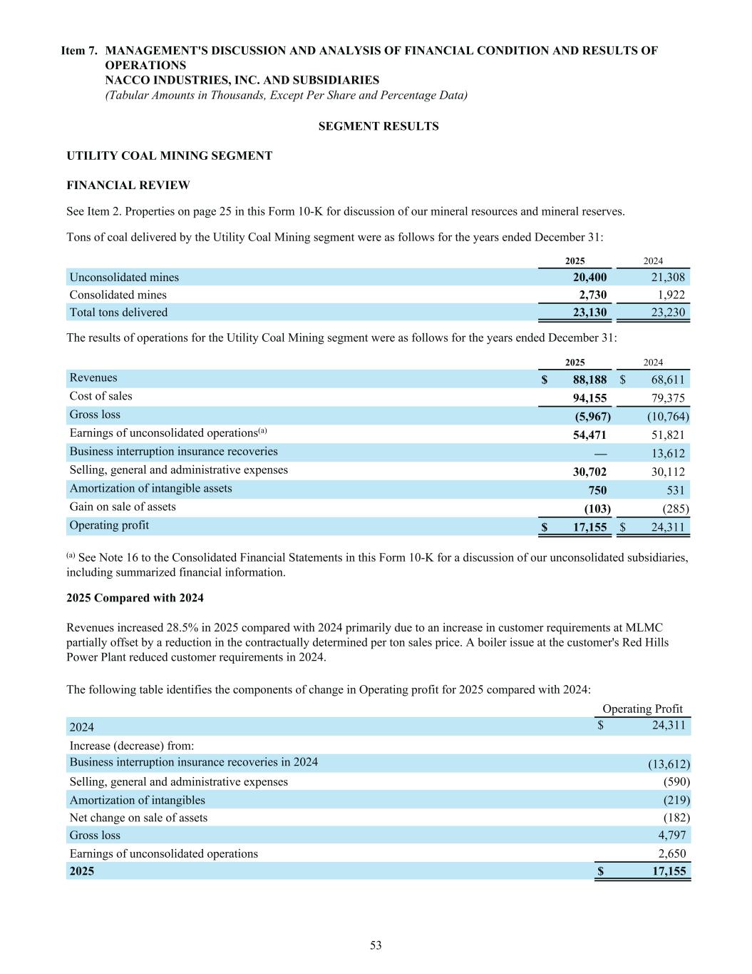 SEGMENT RESULTS UTILITY COAL MINING SEGMENT FINANCIAL REVIEW See Item 2. Properties on page 25 in this Form 10-K for discussion of our mineral resources and mineral reserves. Tons of coal delivered by the Utility Coal Mining segment were as follows for the years ended December 31: 2025 2024 Unconsolidated mines 20,400 21,308 Consolidated mines 2,730 1,922 Total tons delivered 23,130 23,230 The results of operations for the Utility Coal Mining segment were as follows for the years ended December 31: 2025 2024 Revenues $ 88,188 $ 68,611 Cost of sales 94,155 79,375 Gross loss (5,967) (10,764) Earnings of unconsolidated operations(a) 54,471 51,821 Business interruption insurance recoveries — 13,612 Selling, general and administrative expenses 30,702 30,112 Amortization of intangible assets 750 531 Gain on sale of assets (103) (285) Operating profit $ 17,155 $ 24,311 (a) See Note 16 to the Consolidated Financial Statements in this Form 10-K for a discussion of our unconsolidated subsidiaries, including summarized financial information. 2025 Compared with 2024 Revenues increased 28.5% in 2025 compared with 2024 primarily due to an increase in customer requirements at MLMC partially offset by a reduction in the contractually determined per ton sales price. A boiler issue at the customer's Red Hills Power Plant reduced customer requirements in 2024. The following table identifies the components of change in Operating profit for 2025 compared with 2024: Operating Profit 2024 $ 24,311 Increase (decrease) from: Business interruption insurance recoveries in 2024 (13,612) Selling, general and administrative expenses (590) Amortization of intangibles (219) Net change on sale of assets (182) Gross loss 4,797 Earnings of unconsolidated operations 2,650 2025 $ 17,155 Item 7. MANAGEMENT'S DISCUSSION AND ANALYSIS OF FINANCIAL CONDITION AND RESULTS OF OPERATIONS NACCO INDUSTRIES, INC. AND SUBSIDIARIES (Tabular Amounts in Thousands, Except Per Share and Percentage Data) 53