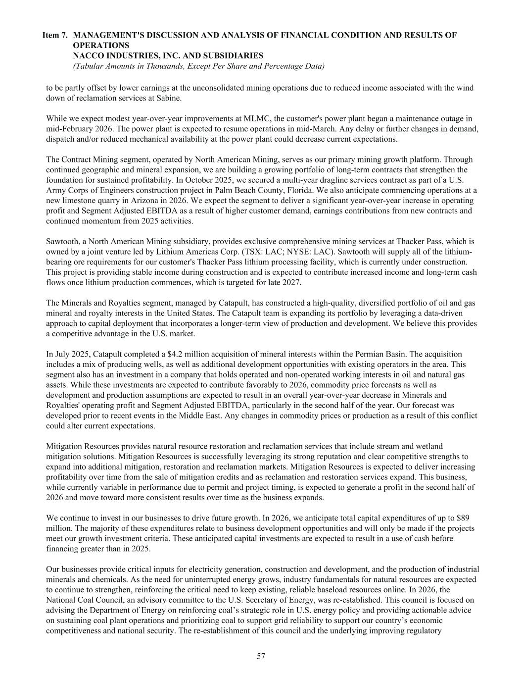 to be partly offset by lower earnings at the unconsolidated mining operations due to reduced income associated with the wind down of reclamation services at Sabine. While we expect modest year-over-year improvements at MLMC, the customer's power plant began a maintenance outage in mid-February 2026. The power plant is expected to resume operations in mid-March. Any delay or further changes in demand, dispatch and/or reduced mechanical availability at the power plant could decrease current expectations. The Contract Mining segment, operated by North American Mining, serves as our primary mining growth platform. Through continued geographic and mineral expansion, we are building a growing portfolio of long-term contracts that strengthen the foundation for sustained profitability. In October 2025, we secured a multi-year dragline services contract as part of a U.S. Army Corps of Engineers construction project in Palm Beach County, Florida. We also anticipate commencing operations at a new limestone quarry in Arizona in 2026. We expect the segment to deliver a significant year-over-year increase in operating profit and Segment Adjusted EBITDA as a result of higher customer demand, earnings contributions from new contracts and continued momentum from 2025 activities. Sawtooth, a North American Mining subsidiary, provides exclusive comprehensive mining services at Thacker Pass, which is owned by a joint venture led by Lithium Americas Corp. (TSX: LAC; NYSE: LAC). Sawtooth will supply all of the lithium- bearing ore requirements for our customer's Thacker Pass lithium processing facility, which is currently under construction. This project is providing stable income during construction and is expected to contribute increased income and long-term cash flows once lithium production commences, which is targeted for late 2027. The Minerals and Royalties segment, managed by Catapult, has constructed a high-quality, diversified portfolio of oil and gas mineral and royalty interests in the United States. The Catapult team is expanding its portfolio by leveraging a data-driven approach to capital deployment that incorporates a longer-term view of production and development. We believe this provides a competitive advantage in the U.S. market. In July 2025, Catapult completed a $4.2 million acquisition of mineral interests within the Permian Basin. The acquisition includes a mix of producing wells, as well as additional development opportunities with existing operators in the area. This segment also has an investment in a company that holds operated and non-operated working interests in oil and natural gas assets. While these investments are expected to contribute favorably to 2026, commodity price forecasts as well as development and production assumptions are expected to result in an overall year-over-year decrease in Minerals and Royalties' operating profit and Segment Adjusted EBITDA, particularly in the second half of the year. Our forecast was developed prior to recent events in the Middle East. Any changes in commodity prices or production as a result of this conflict could alter current expectations. Mitigation Resources provides natural resource restoration and reclamation services that include stream and wetland mitigation solutions. Mitigation Resources is successfully leveraging its strong reputation and clear competitive strengths to expand into additional mitigation, restoration and reclamation markets. Mitigation Resources is expected to deliver increasing profitability over time from the sale of mitigation credits and as reclamation and restoration services expand. This business, while currently variable in performance due to permit and project timing, is expected to generate a profit in the second half of 2026 and move toward more consistent results over time as the business expands. We continue to invest in our businesses to drive future growth. In 2026, we anticipate total capital expenditures of up to $89 million. The majority of these expenditures relate to business development opportunities and will only be made if the projects meet our growth investment criteria. These anticipated capital investments are expected to result in a use of cash before financing greater than in 2025. Our businesses provide critical inputs for electricity generation, construction and development, and the production of industrial minerals and chemicals. As the need for uninterrupted energy grows, industry fundamentals for natural resources are expected to continue to strengthen, reinforcing the critical need to keep existing, reliable baseload resources online. In 2026, the National Coal Council, an advisory committee to the U.S. Secretary of Energy, was re-established. This council is focused on advising the Department of Energy on reinforcing coal’s strategic role in U.S. energy policy and providing actionable advice on sustaining coal plant operations and prioritizing coal to support grid reliability to support our country’s economic competitiveness and national security. The re-establishment of this council and the underlying improving regulatory Item 7. MANAGEMENT'S DISCUSSION AND ANALYSIS OF FINANCIAL CONDITION AND RESULTS OF OPERATIONS NACCO INDUSTRIES, INC. AND SUBSIDIARIES (Tabular Amounts in Thousands, Except Per Share and Percentage Data) 57