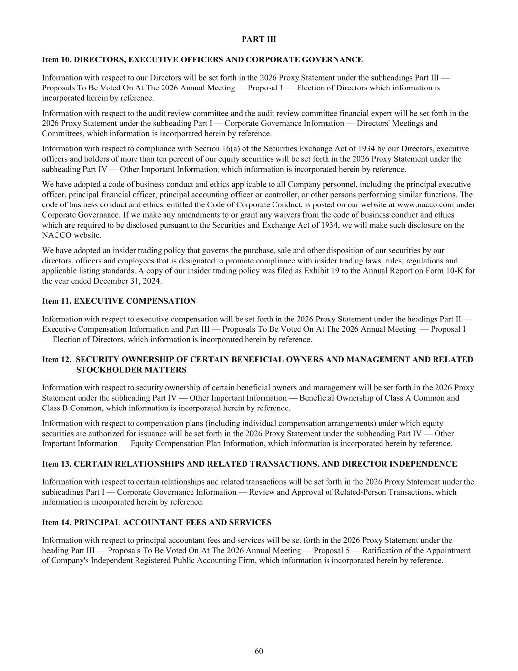 PART III Item 10. DIRECTORS, EXECUTIVE OFFICERS AND CORPORATE GOVERNANCE Information with respect to our Directors will be set forth in the 2026 Proxy Statement under the subheadings Part III — Proposals To Be Voted On At The 2026 Annual Meeting — Proposal 1 — Election of Directors which information is incorporated herein by reference. Information with respect to the audit review committee and the audit review committee financial expert will be set forth in the 2026 Proxy Statement under the subheading Part I — Corporate Governance Information — Directors' Meetings and Committees, which information is incorporated herein by reference. Information with respect to compliance with Section 16(a) of the Securities Exchange Act of 1934 by our Directors, executive officers and holders of more than ten percent of our equity securities will be set forth in the 2026 Proxy Statement under the subheading Part IV — Other Important Information, which information is incorporated herein by reference. We have adopted a code of business conduct and ethics applicable to all Company personnel, including the principal executive officer, principal financial officer, principal accounting officer or controller, or other persons performing similar functions. The code of business conduct and ethics, entitled the Code of Corporate Conduct, is posted on our website at www.nacco.com under Corporate Governance. If we make any amendments to or grant any waivers from the code of business conduct and ethics which are required to be disclosed pursuant to the Securities and Exchange Act of 1934, we will make such disclosure on the NACCO website. We have adopted an insider trading policy that governs the purchase, sale and other disposition of our securities by our directors, officers and employees that is designated to promote compliance with insider trading laws, rules, regulations and applicable listing standards. A copy of our insider trading policy was filed as Exhibit 19 to the Annual Report on Form 10-K for the year ended December 31, 2024. Item 11. EXECUTIVE COMPENSATION Information with respect to executive compensation will be set forth in the 2026 Proxy Statement under the headings Part II — Executive Compensation Information and Part III — Proposals To Be Voted On At The 2026 Annual Meeting — Proposal 1 — Election of Directors, which information is incorporated herein by reference. Item 12. SECURITY OWNERSHIP OF CERTAIN BENEFICIAL OWNERS AND MANAGEMENT AND RELATED STOCKHOLDER MATTERS Information with respect to security ownership of certain beneficial owners and management will be set forth in the 2026 Proxy Statement under the subheading Part IV — Other Important Information — Beneficial Ownership of Class A Common and Class B Common, which information is incorporated herein by reference. Information with respect to compensation plans (including individual compensation arrangements) under which equity securities are authorized for issuance will be set forth in the 2026 Proxy Statement under the subheading Part IV — Other Important Information — Equity Compensation Plan Information, which information is incorporated herein by reference. Item 13. CERTAIN RELATIONSHIPS AND RELATED TRANSACTIONS, AND DIRECTOR INDEPENDENCE Information with respect to certain relationships and related transactions will be set forth in the 2026 Proxy Statement under the subheadings Part I — Corporate Governance Information — Review and Approval of Related-Person Transactions, which information is incorporated herein by reference. Item 14. PRINCIPAL ACCOUNTANT FEES AND SERVICES Information with respect to principal accountant fees and services will be set forth in the 2026 Proxy Statement under the heading Part III — Proposals To Be Voted On At The 2026 Annual Meeting — Proposal 5 — Ratification of the Appointment of Company's Independent Registered Public Accounting Firm, which information is incorporated herein by reference. 60