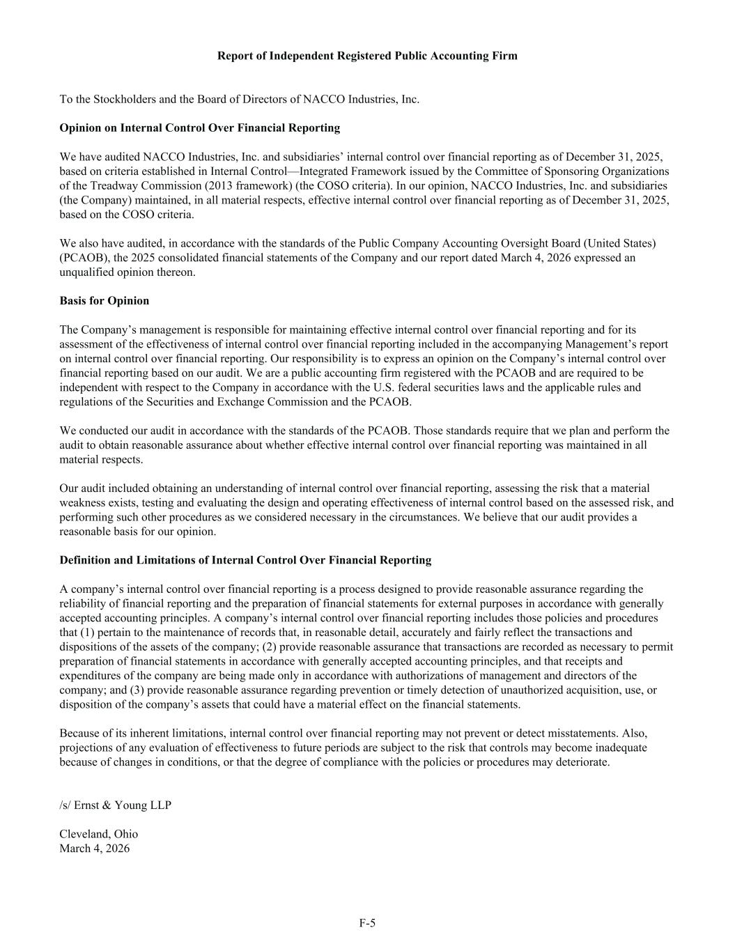 Report of Independent Registered Public Accounting Firm To the Stockholders and the Board of Directors of NACCO Industries, Inc. Opinion on Internal Control Over Financial Reporting We have audited NACCO Industries, Inc. and subsidiaries’ internal control over financial reporting as of December 31, 2025, based on criteria established in Internal Control—Integrated Framework issued by the Committee of Sponsoring Organizations of the Treadway Commission (2013 framework) (the COSO criteria). In our opinion, NACCO Industries, Inc. and subsidiaries (the Company) maintained, in all material respects, effective internal control over financial reporting as of December 31, 2025, based on the COSO criteria. We also have audited, in accordance with the standards of the Public Company Accounting Oversight Board (United States) (PCAOB), the 2025 consolidated financial statements of the Company and our report dated March 4, 2026 expressed an unqualified opinion thereon. Basis for Opinion The Company’s management is responsible for maintaining effective internal control over financial reporting and for its assessment of the effectiveness of internal control over financial reporting included in the accompanying Management’s report on internal control over financial reporting. Our responsibility is to express an opinion on the Company’s internal control over financial reporting based on our audit. We are a public accounting firm registered with the PCAOB and are required to be independent with respect to the Company in accordance with the U.S. federal securities laws and the applicable rules and regulations of the Securities and Exchange Commission and the PCAOB. We conducted our audit in accordance with the standards of the PCAOB. Those standards require that we plan and perform the audit to obtain reasonable assurance about whether effective internal control over financial reporting was maintained in all material respects. Our audit included obtaining an understanding of internal control over financial reporting, assessing the risk that a material weakness exists, testing and evaluating the design and operating effectiveness of internal control based on the assessed risk, and performing such other procedures as we considered necessary in the circumstances. We believe that our audit provides a reasonable basis for our opinion. Definition and Limitations of Internal Control Over Financial Reporting A company’s internal control over financial reporting is a process designed to provide reasonable assurance regarding the reliability of financial reporting and the preparation of financial statements for external purposes in accordance with generally accepted accounting principles. A company’s internal control over financial reporting includes those policies and procedures that (1) pertain to the maintenance of records that, in reasonable detail, accurately and fairly reflect the transactions and dispositions of the assets of the company; (2) provide reasonable assurance that transactions are recorded as necessary to permit preparation of financial statements in accordance with generally accepted accounting principles, and that receipts and expenditures of the company are being made only in accordance with authorizations of management and directors of the company; and (3) provide reasonable assurance regarding prevention or timely detection of unauthorized acquisition, use, or disposition of the company’s assets that could have a material effect on the financial statements. Because of its inherent limitations, internal control over financial reporting may not prevent or detect misstatements. Also, projections of any evaluation of effectiveness to future periods are subject to the risk that controls may become inadequate because of changes in conditions, or that the degree of compliance with the policies or procedures may deteriorate. /s/ Ernst & Young LLP Cleveland, Ohio March 4, 2026 F-5