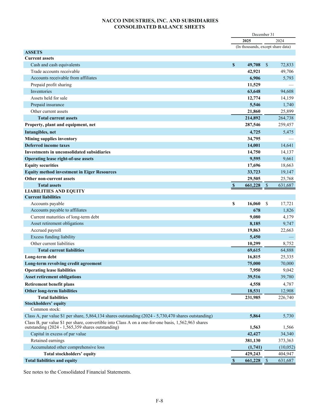 NACCO INDUSTRIES, INC. AND SUBSIDIARIES CONSOLIDATED BALANCE SHEETS December 31 2025 2024 (In thousands, except share data) ASSETS Current assets Cash and cash equivalents $ 49,708 $ 72,833 Trade accounts receivable 42,921 49,706 Accounts receivable from affiliates 6,906 5,793 Prepaid profit sharing 11,529 — Inventories 63,648 94,608 Assets held for sale 12,774 14,159 Prepaid insurance 5,546 1,740 Other current assets 21,860 25,899 Total current assets 214,892 264,738 Property, plant and equipment, net 287,546 259,457 Intangibles, net 4,725 5,475 Mining supplies inventory 34,795 — Deferred income taxes 14,001 14,641 Investments in unconsolidated subsidiaries 14,750 14,137 Operating lease right-of-use assets 9,595 9,661 Equity securities 17,696 18,663 Equity method investment in Eiger Resources 33,723 19,147 Other non-current assets 29,505 25,768 Total assets $ 661,228 $ 631,687 LIABILITIES AND EQUITY Current liabilities Accounts payable $ 16,060 $ 17,721 Accounts payable to affiliates 678 1,826 Current maturities of long-term debt 9,080 4,179 Asset retirement obligations 8,185 9,747 Accrued payroll 19,863 22,663 Excess funding liability 5,450 — Other current liabilities 10,299 8,752 Total current liabilities 69,615 64,888 Long-term debt 16,815 25,335 Long-term revolving credit agreement 75,000 70,000 Operating lease liabilities 7,950 9,042 Asset retirement obligations 39,516 39,780 Retirement benefit plans 4,558 4,787 Other long-term liabilities 18,531 12,908 Total liabilities 231,985 226,740 Stockholders’ equity Common stock: Class A, par value $1 per share, 5,864,134 shares outstanding (2024 - 5,730,470 shares outstanding) 5,864 5,730 Class B, par value $1 per share, convertible into Class A on a one-for-one basis, 1,562,963 shares outstanding (2024 - 1,565,359 shares outstanding) 1,563 1,566 Capital in excess of par value 42,427 34,340 Retained earnings 381,130 373,363 Accumulated other comprehensive loss (1,741) (10,052) Total stockholders’ equity 429,243 404,947 Total liabilities and equity $ 661,228 $ 631,687 See notes to the Consolidated Financial Statements. F-8