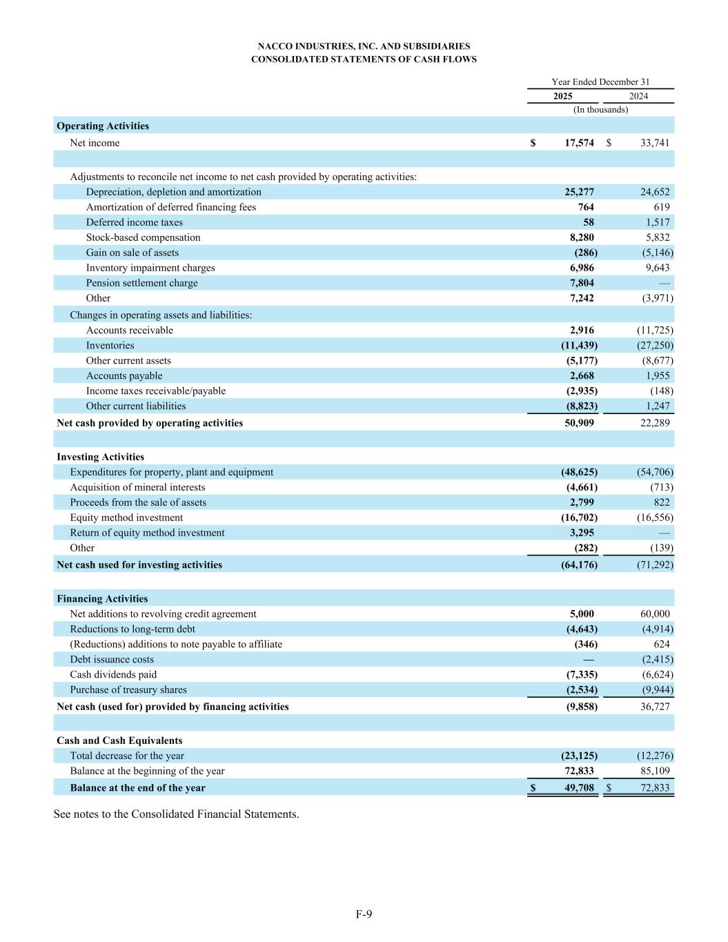 NACCO INDUSTRIES, INC. AND SUBSIDIARIES CONSOLIDATED STATEMENTS OF CASH FLOWS Year Ended December 31 2025 2024 (In thousands) Operating Activities Net income $ 17,574 $ 33,741 Adjustments to reconcile net income to net cash provided by operating activities: Depreciation, depletion and amortization 25,277 24,652 Amortization of deferred financing fees 764 619 Deferred income taxes 58 1,517 Stock-based compensation 8,280 5,832 Gain on sale of assets (286) (5,146) Inventory impairment charges 6,986 9,643 Pension settlement charge 7,804 — Other 7,242 (3,971) Changes in operating assets and liabilities: Accounts receivable 2,916 (11,725) Inventories (11,439) (27,250) Other current assets (5,177) (8,677) Accounts payable 2,668 1,955 Income taxes receivable/payable (2,935) (148) Other current liabilities (8,823) 1,247 Net cash provided by operating activities 50,909 22,289 Investing Activities Expenditures for property, plant and equipment (48,625) (54,706) Acquisition of mineral interests (4,661) (713) Proceeds from the sale of assets 2,799 822 Equity method investment (16,702) (16,556) Return of equity method investment 3,295 — Other (282) (139) Net cash used for investing activities (64,176) (71,292) Financing Activities Net additions to revolving credit agreement 5,000 60,000 Reductions to long-term debt (4,643) (4,914) (Reductions) additions to note payable to affiliate (346) 624 Debt issuance costs — (2,415) Cash dividends paid (7,335) (6,624) Purchase of treasury shares (2,534) (9,944) Net cash (used for) provided by financing activities (9,858) 36,727 Cash and Cash Equivalents Total decrease for the year (23,125) (12,276) Balance at the beginning of the year 72,833 85,109 Balance at the end of the year $ 49,708 $ 72,833 See notes to the Consolidated Financial Statements. F-9