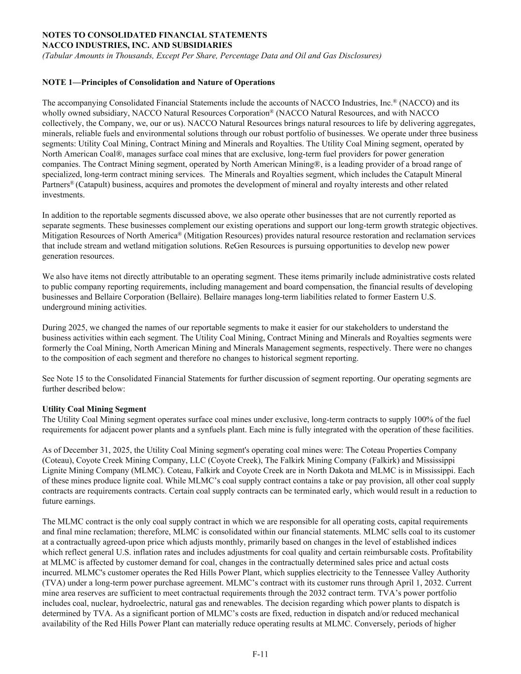 NOTE 1—Principles of Consolidation and Nature of Operations The accompanying Consolidated Financial Statements include the accounts of NACCO Industries, Inc.® (NACCO) and its wholly owned subsidiary, NACCO Natural Resources Corporation® (NACCO Natural Resources, and with NACCO collectively, the Company, we, our or us). NACCO Natural Resources brings natural resources to life by delivering aggregates, minerals, reliable fuels and environmental solutions through our robust portfolio of businesses. We operate under three business segments: Utility Coal Mining, Contract Mining and Minerals and Royalties. The Utility Coal Mining segment, operated by North American Coal®, manages surface coal mines that are exclusive, long-term fuel providers for power generation companies. The Contract Mining segment, operated by North American Mining®, is a leading provider of a broad range of specialized, long-term contract mining services. The Minerals and Royalties segment, which includes the Catapult Mineral Partners® (Catapult) business, acquires and promotes the development of mineral and royalty interests and other related investments. In addition to the reportable segments discussed above, we also operate other businesses that are not currently reported as separate segments. These businesses complement our existing operations and support our long-term growth strategic objectives. Mitigation Resources of North America® (Mitigation Resources) provides natural resource restoration and reclamation services that include stream and wetland mitigation solutions. ReGen Resources is pursuing opportunities to develop new power generation resources. We also have items not directly attributable to an operating segment. These items primarily include administrative costs related to public company reporting requirements, including management and board compensation, the financial results of developing businesses and Bellaire Corporation (Bellaire). Bellaire manages long-term liabilities related to former Eastern U.S. underground mining activities. During 2025, we changed the names of our reportable segments to make it easier for our stakeholders to understand the business activities within each segment. The Utility Coal Mining, Contract Mining and Minerals and Royalties segments were formerly the Coal Mining, North American Mining and Minerals Management segments, respectively. There were no changes to the composition of each segment and therefore no changes to historical segment reporting. See Note 15 to the Consolidated Financial Statements for further discussion of segment reporting. Our operating segments are further described below: Utility Coal Mining Segment The Utility Coal Mining segment operates surface coal mines under exclusive, long-term contracts to supply 100% of the fuel requirements for adjacent power plants and a synfuels plant. Each mine is fully integrated with the operation of these facilities. As of December 31, 2025, the Utility Coal Mining segment's operating coal mines were: The Coteau Properties Company (Coteau), Coyote Creek Mining Company, LLC (Coyote Creek), The Falkirk Mining Company (Falkirk) and Mississippi Lignite Mining Company (MLMC). Coteau, Falkirk and Coyote Creek are in North Dakota and MLMC is in Mississippi. Each of these mines produce lignite coal. While MLMC’s coal supply contract contains a take or pay provision, all other coal supply contracts are requirements contracts. Certain coal supply contracts can be terminated early, which would result in a reduction to future earnings. The MLMC contract is the only coal supply contract in which we are responsible for all operating costs, capital requirements and final mine reclamation; therefore, MLMC is consolidated within our financial statements. MLMC sells coal to its customer at a contractually agreed-upon price which adjusts monthly, primarily based on changes in the level of established indices which reflect general U.S. inflation rates and includes adjustments for coal quality and certain reimbursable costs. Profitability at MLMC is affected by customer demand for coal, changes in the contractually determined sales price and actual costs incurred. MLMC's customer operates the Red Hills Power Plant, which supplies electricity to the Tennessee Valley Authority (TVA) under a long-term power purchase agreement. MLMC’s contract with its customer runs through April 1, 2032. Current mine area reserves are sufficient to meet contractual requirements through the 2032 contract term. TVA’s power portfolio includes coal, nuclear, hydroelectric, natural gas and renewables. The decision regarding which power plants to dispatch is determined by TVA. As a significant portion of MLMC’s costs are fixed, reduction in dispatch and/or reduced mechanical availability of the Red Hills Power Plant can materially reduce operating results at MLMC. Conversely, periods of higher NOTES TO CONSOLIDATED FINANCIAL STATEMENTS NACCO INDUSTRIES, INC. AND SUBSIDIARIES (Tabular Amounts in Thousands, Except Per Share, Percentage Data and Oil and Gas Disclosures) F-11