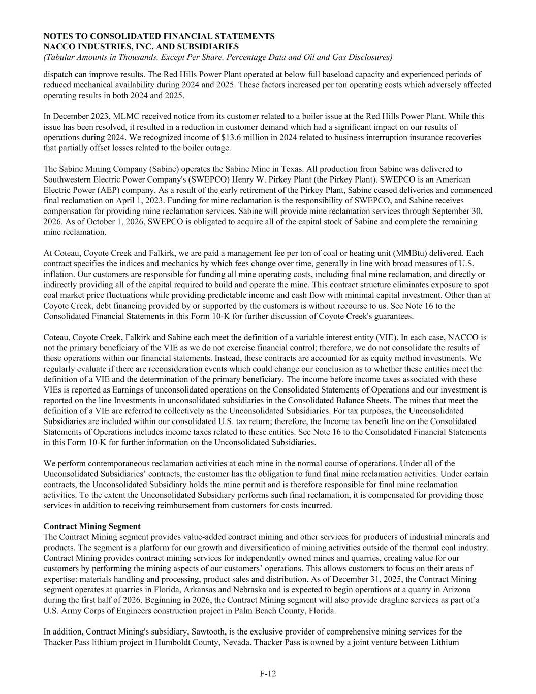 dispatch can improve results. The Red Hills Power Plant operated at below full baseload capacity and experienced periods of reduced mechanical availability during 2024 and 2025. These factors increased per ton operating costs which adversely affected operating results in both 2024 and 2025. In December 2023, MLMC received notice from its customer related to a boiler issue at the Red Hills Power Plant. While this issue has been resolved, it resulted in a reduction in customer demand which had a significant impact on our results of operations during 2024. We recognized income of $13.6 million in 2024 related to business interruption insurance recoveries that partially offset losses related to the boiler outage. The Sabine Mining Company (Sabine) operates the Sabine Mine in Texas. All production from Sabine was delivered to Southwestern Electric Power Company's (SWEPCO) Henry W. Pirkey Plant (the Pirkey Plant). SWEPCO is an American Electric Power (AEP) company. As a result of the early retirement of the Pirkey Plant, Sabine ceased deliveries and commenced final reclamation on April 1, 2023. Funding for mine reclamation is the responsibility of SWEPCO, and Sabine receives compensation for providing mine reclamation services. Sabine will provide mine reclamation services through September 30, 2026. As of October 1, 2026, SWEPCO is obligated to acquire all of the capital stock of Sabine and complete the remaining mine reclamation. At Coteau, Coyote Creek and Falkirk, we are paid a management fee per ton of coal or heating unit (MMBtu) delivered. Each contract specifies the indices and mechanics by which fees change over time, generally in line with broad measures of U.S. inflation. Our customers are responsible for funding all mine operating costs, including final mine reclamation, and directly or indirectly providing all of the capital required to build and operate the mine. This contract structure eliminates exposure to spot coal market price fluctuations while providing predictable income and cash flow with minimal capital investment. Other than at Coyote Creek, debt financing provided by or supported by the customers is without recourse to us. See Note 16 to the Consolidated Financial Statements in this Form 10-K for further discussion of Coyote Creek's guarantees. Coteau, Coyote Creek, Falkirk and Sabine each meet the definition of a variable interest entity (VIE). In each case, NACCO is not the primary beneficiary of the VIE as we do not exercise financial control; therefore, we do not consolidate the results of these operations within our financial statements. Instead, these contracts are accounted for as equity method investments. We regularly evaluate if there are reconsideration events which could change our conclusion as to whether these entities meet the definition of a VIE and the determination of the primary beneficiary. The income before income taxes associated with these VIEs is reported as Earnings of unconsolidated operations on the Consolidated Statements of Operations and our investment is reported on the line Investments in unconsolidated subsidiaries in the Consolidated Balance Sheets. The mines that meet the definition of a VIE are referred to collectively as the Unconsolidated Subsidiaries. For tax purposes, the Unconsolidated Subsidiaries are included within our consolidated U.S. tax return; therefore, the Income tax benefit line on the Consolidated Statements of Operations includes income taxes related to these entities. See Note 16 to the Consolidated Financial Statements in this Form 10-K for further information on the Unconsolidated Subsidiaries. We perform contemporaneous reclamation activities at each mine in the normal course of operations. Under all of the Unconsolidated Subsidiaries’ contracts, the customer has the obligation to fund final mine reclamation activities. Under certain contracts, the Unconsolidated Subsidiary holds the mine permit and is therefore responsible for final mine reclamation activities. To the extent the Unconsolidated Subsidiary performs such final reclamation, it is compensated for providing those services in addition to receiving reimbursement from customers for costs incurred. Contract Mining Segment The Contract Mining segment provides value-added contract mining and other services for producers of industrial minerals and products. The segment is a platform for our growth and diversification of mining activities outside of the thermal coal industry. Contract Mining provides contract mining services for independently owned mines and quarries, creating value for our customers by performing the mining aspects of our customers’ operations. This allows customers to focus on their areas of expertise: materials handling and processing, product sales and distribution. As of December 31, 2025, the Contract Mining segment operates at quarries in Florida, Arkansas and Nebraska and is expected to begin operations at a quarry in Arizona during the first half of 2026. Beginning in 2026, the Contract Mining segment will also provide dragline services as part of a U.S. Army Corps of Engineers construction project in Palm Beach County, Florida. In addition, Contract Mining's subsidiary, Sawtooth, is the exclusive provider of comprehensive mining services for the Thacker Pass lithium project in Humboldt County, Nevada. Thacker Pass is owned by a joint venture between Lithium NOTES TO CONSOLIDATED FINANCIAL STATEMENTS NACCO INDUSTRIES, INC. AND SUBSIDIARIES (Tabular Amounts in Thousands, Except Per Share, Percentage Data and Oil and Gas Disclosures) F-12