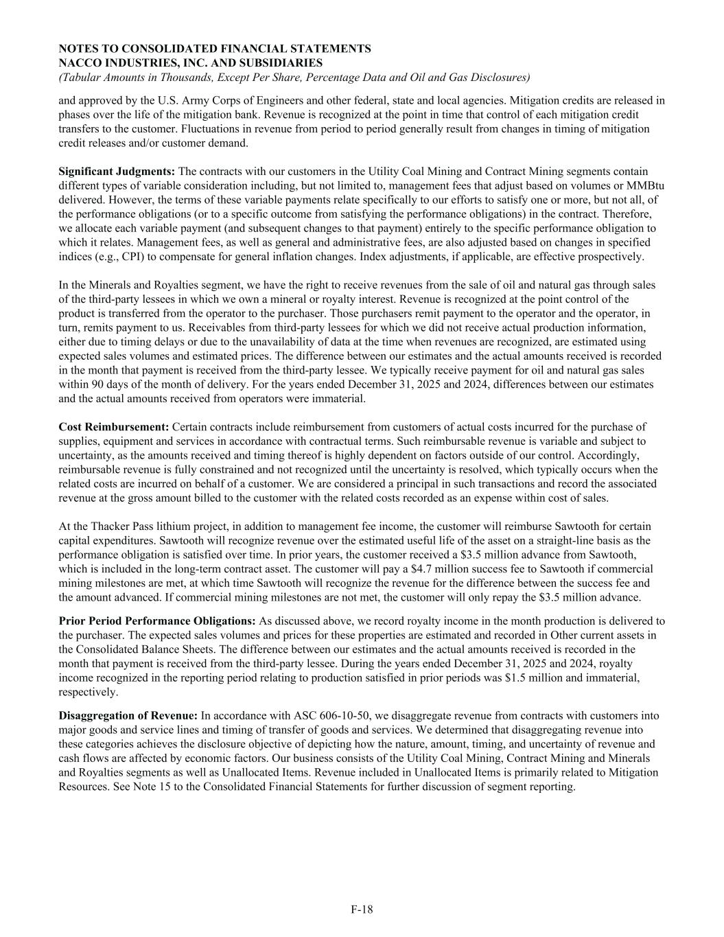and approved by the U.S. Army Corps of Engineers and other federal, state and local agencies. Mitigation credits are released in phases over the life of the mitigation bank. Revenue is recognized at the point in time that control of each mitigation credit transfers to the customer. Fluctuations in revenue from period to period generally result from changes in timing of mitigation credit releases and/or customer demand. Significant Judgments: The contracts with our customers in the Utility Coal Mining and Contract Mining segments contain different types of variable consideration including, but not limited to, management fees that adjust based on volumes or MMBtu delivered. However, the terms of these variable payments relate specifically to our efforts to satisfy one or more, but not all, of the performance obligations (or to a specific outcome from satisfying the performance obligations) in the contract. Therefore, we allocate each variable payment (and subsequent changes to that payment) entirely to the specific performance obligation to which it relates. Management fees, as well as general and administrative fees, are also adjusted based on changes in specified indices (e.g., CPI) to compensate for general inflation changes. Index adjustments, if applicable, are effective prospectively. In the Minerals and Royalties segment, we have the right to receive revenues from the sale of oil and natural gas through sales of the third-party lessees in which we own a mineral or royalty interest. Revenue is recognized at the point control of the product is transferred from the operator to the purchaser. Those purchasers remit payment to the operator and the operator, in turn, remits payment to us. Receivables from third-party lessees for which we did not receive actual production information, either due to timing delays or due to the unavailability of data at the time when revenues are recognized, are estimated using expected sales volumes and estimated prices. The difference between our estimates and the actual amounts received is recorded in the month that payment is received from the third-party lessee. We typically receive payment for oil and natural gas sales within 90 days of the month of delivery. For the years ended December 31, 2025 and 2024, differences between our estimates and the actual amounts received from operators were immaterial. Cost Reimbursement: Certain contracts include reimbursement from customers of actual costs incurred for the purchase of supplies, equipment and services in accordance with contractual terms. Such reimbursable revenue is variable and subject to uncertainty, as the amounts received and timing thereof is highly dependent on factors outside of our control. Accordingly, reimbursable revenue is fully constrained and not recognized until the uncertainty is resolved, which typically occurs when the related costs are incurred on behalf of a customer. We are considered a principal in such transactions and record the associated revenue at the gross amount billed to the customer with the related costs recorded as an expense within cost of sales. At the Thacker Pass lithium project, in addition to management fee income, the customer will reimburse Sawtooth for certain capital expenditures. Sawtooth will recognize revenue over the estimated useful life of the asset on a straight-line basis as the performance obligation is satisfied over time. In prior years, the customer received a $3.5 million advance from Sawtooth, which is included in the long-term contract asset. The customer will pay a $4.7 million success fee to Sawtooth if commercial mining milestones are met, at which time Sawtooth will recognize the revenue for the difference between the success fee and the amount advanced. If commercial mining milestones are not met, the customer will only repay the $3.5 million advance. Prior Period Performance Obligations: As discussed above, we record royalty income in the month production is delivered to the purchaser. The expected sales volumes and prices for these properties are estimated and recorded in Other current assets in the Consolidated Balance Sheets. The difference between our estimates and the actual amounts received is recorded in the month that payment is received from the third-party lessee. During the years ended December 31, 2025 and 2024, royalty income recognized in the reporting period relating to production satisfied in prior periods was $1.5 million and immaterial, respectively. Disaggregation of Revenue: In accordance with ASC 606-10-50, we disaggregate revenue from contracts with customers into major goods and service lines and timing of transfer of goods and services. We determined that disaggregating revenue into these categories achieves the disclosure objective of depicting how the nature, amount, timing, and uncertainty of revenue and cash flows are affected by economic factors. Our business consists of the Utility Coal Mining, Contract Mining and Minerals and Royalties segments as well as Unallocated Items. Revenue included in Unallocated Items is primarily related to Mitigation Resources. See Note 15 to the Consolidated Financial Statements for further discussion of segment reporting. NOTES TO CONSOLIDATED FINANCIAL STATEMENTS NACCO INDUSTRIES, INC. AND SUBSIDIARIES (Tabular Amounts in Thousands, Except Per Share, Percentage Data and Oil and Gas Disclosures) F-18