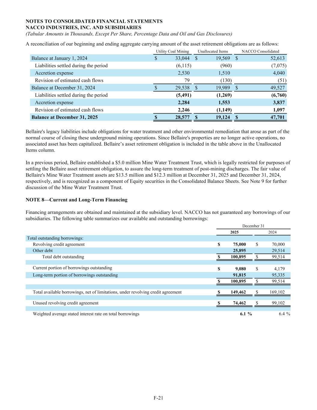 A reconciliation of our beginning and ending aggregate carrying amount of the asset retirement obligations are as follows: Utility Coal Mining Unallocated Items NACCO Consolidated Balance at January 1, 2024 $ 33,044 $ 19,569 $ 52,613 Liabilities settled during the period (6,115) (960) (7,075) Accretion expense 2,530 1,510 4,040 Revision of estimated cash flows 79 (130) (51) Balance at December 31, 2024 $ 29,538 $ 19,989 $ 49,527 Liabilities settled during the period (5,491) (1,269) (6,760) Accretion expense 2,284 1,553 3,837 Revision of estimated cash flows 2,246 (1,149) 1,097 Balance at December 31, 2025 $ 28,577 $ 19,124 $ 47,701 Bellaire's legacy liabilities include obligations for water treatment and other environmental remediation that arose as part of the normal course of closing these underground mining operations. Since Bellaire's properties are no longer active operations, no associated asset has been capitalized. Bellaire’s asset retirement obligation is included in the table above in the Unallocated Items column. In a previous period, Bellaire established a $5.0 million Mine Water Treatment Trust, which is legally restricted for purposes of settling the Bellaire asset retirement obligation, to assure the long-term treatment of post-mining discharges. The fair value of Bellaire's Mine Water Treatment assets are $13.5 million and $12.3 million at December 31, 2025 and December 31, 2024, respectively, and is recognized as a component of Equity securities in the Consolidated Balance Sheets. See Note 9 for further discussion of the Mine Water Treatment Trust. NOTE 8—Current and Long-Term Financing Financing arrangements are obtained and maintained at the subsidiary level. NACCO has not guaranteed any borrowings of our subsidiaries. The following table summarizes our available and outstanding borrowings: December 31 2025 2024 Total outstanding borrowings: Revolving credit agreement $ 75,000 $ 70,000 Other debt 25,895 29,514 Total debt outstanding $ 100,895 $ 99,514 Current portion of borrowings outstanding $ 9,080 $ 4,179 Long-term portion of borrowings outstanding 91,815 95,335 $ 100,895 $ 99,514 Total available borrowings, net of limitations, under revolving credit agreement $ 149,462 $ 169,102 Unused revolving credit agreement $ 74,462 $ 99,102 Weighted average stated interest rate on total borrowings 6.1 % 6.4 % NOTES TO CONSOLIDATED FINANCIAL STATEMENTS NACCO INDUSTRIES, INC. AND SUBSIDIARIES (Tabular Amounts in Thousands, Except Per Share, Percentage Data and Oil and Gas Disclosures) F-21