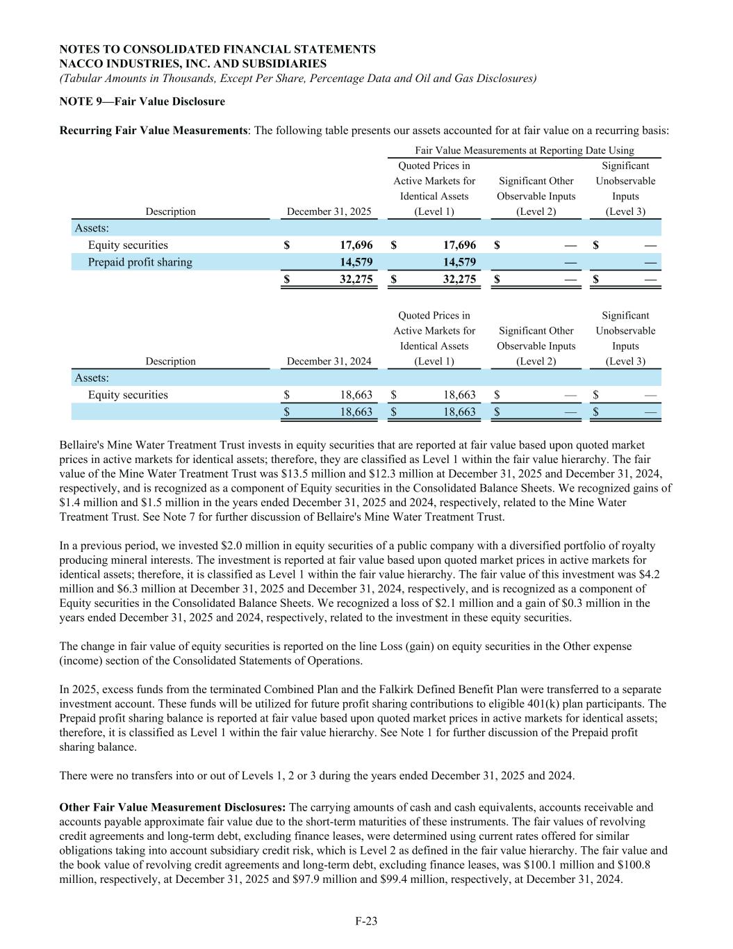 NOTE 9—Fair Value Disclosure Recurring Fair Value Measurements: The following table presents our assets accounted for at fair value on a recurring basis: Fair Value Measurements at Reporting Date Using Quoted Prices in Significant Active Markets for Significant Other Unobservable Identical Assets Observable Inputs Inputs Description December 31, 2025 (Level 1) (Level 2) (Level 3) Assets: Equity securities $ 17,696 $ 17,696 $ — $ — Prepaid profit sharing 14,579 14,579 — — $ 32,275 $ 32,275 $ — $ — Quoted Prices in Significant Active Markets for Significant Other Unobservable Identical Assets Observable Inputs Inputs Description December 31, 2024 (Level 1) (Level 2) (Level 3) Assets: Equity securities $ 18,663 $ 18,663 $ — $ — $ 18,663 $ 18,663 $ — $ — Bellaire's Mine Water Treatment Trust invests in equity securities that are reported at fair value based upon quoted market prices in active markets for identical assets; therefore, they are classified as Level 1 within the fair value hierarchy. The fair value of the Mine Water Treatment Trust was $13.5 million and $12.3 million at December 31, 2025 and December 31, 2024, respectively, and is recognized as a component of Equity securities in the Consolidated Balance Sheets. We recognized gains of $1.4 million and $1.5 million in the years ended December 31, 2025 and 2024, respectively, related to the Mine Water Treatment Trust. See Note 7 for further discussion of Bellaire's Mine Water Treatment Trust. In a previous period, we invested $2.0 million in equity securities of a public company with a diversified portfolio of royalty producing mineral interests. The investment is reported at fair value based upon quoted market prices in active markets for identical assets; therefore, it is classified as Level 1 within the fair value hierarchy. The fair value of this investment was $4.2 million and $6.3 million at December 31, 2025 and December 31, 2024, respectively, and is recognized as a component of Equity securities in the Consolidated Balance Sheets. We recognized a loss of $2.1 million and a gain of $0.3 million in the years ended December 31, 2025 and 2024, respectively, related to the investment in these equity securities. The change in fair value of equity securities is reported on the line Loss (gain) on equity securities in the Other expense (income) section of the Consolidated Statements of Operations. In 2025, excess funds from the terminated Combined Plan and the Falkirk Defined Benefit Plan were transferred to a separate investment account. These funds will be utilized for future profit sharing contributions to eligible 401(k) plan participants. The Prepaid profit sharing balance is reported at fair value based upon quoted market prices in active markets for identical assets; therefore, it is classified as Level 1 within the fair value hierarchy. See Note 1 for further discussion of the Prepaid profit sharing balance. There were no transfers into or out of Levels 1, 2 or 3 during the years ended December 31, 2025 and 2024. Other Fair Value Measurement Disclosures: The carrying amounts of cash and cash equivalents, accounts receivable and accounts payable approximate fair value due to the short-term maturities of these instruments. The fair values of revolving credit agreements and long-term debt, excluding finance leases, were determined using current rates offered for similar obligations taking into account subsidiary credit risk, which is Level 2 as defined in the fair value hierarchy. The fair value and the book value of revolving credit agreements and long-term debt, excluding finance leases, was $100.1 million and $100.8 million, respectively, at December 31, 2025 and $97.9 million and $99.4 million, respectively, at December 31, 2024. NOTES TO CONSOLIDATED FINANCIAL STATEMENTS NACCO INDUSTRIES, INC. AND SUBSIDIARIES (Tabular Amounts in Thousands, Except Per Share, Percentage Data and Oil and Gas Disclosures) F-23