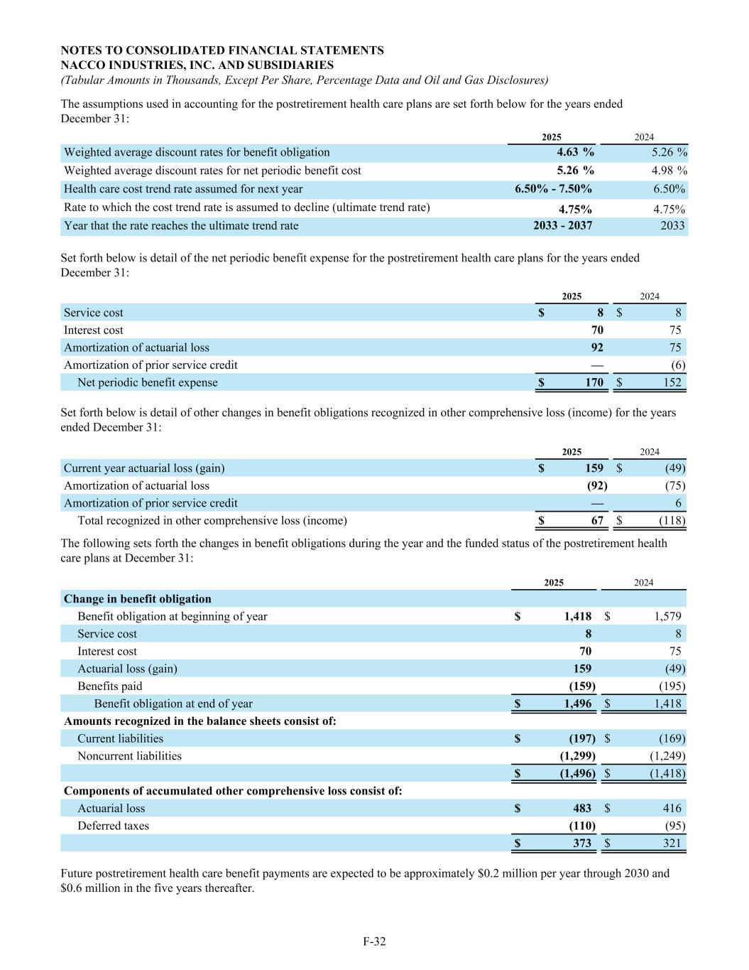 The assumptions used in accounting for the postretirement health care plans are set forth below for the years ended December 31: 2025 2024 Weighted average discount rates for benefit obligation 4.63 % 5.26 % Weighted average discount rates for net periodic benefit cost 5.26 % 4.98 % Health care cost trend rate assumed for next year 6.50% - 7.50% 6.50% Rate to which the cost trend rate is assumed to decline (ultimate trend rate) 4.75% 4.75% Year that the rate reaches the ultimate trend rate 2033 - 2037 2033 Set forth below is detail of the net periodic benefit expense for the postretirement health care plans for the years ended December 31: 2025 2024 Service cost $ 8 $ 8 Interest cost 70 75 Amortization of actuarial loss 92 75 Amortization of prior service credit — (6) Net periodic benefit expense $ 170 $ 152 Set forth below is detail of other changes in benefit obligations recognized in other comprehensive loss (income) for the years ended December 31: 2025 2024 Current year actuarial loss (gain) $ 159 $ (49) Amortization of actuarial loss (92) (75) Amortization of prior service credit — 6 Total recognized in other comprehensive loss (income) $ 67 $ (118) The following sets forth the changes in benefit obligations during the year and the funded status of the postretirement health care plans at December 31: 2025 2024 Change in benefit obligation Benefit obligation at beginning of year $ 1,418 $ 1,579 Service cost 8 8 Interest cost 70 75 Actuarial loss (gain) 159 (49) Benefits paid (159) (195) Benefit obligation at end of year $ 1,496 $ 1,418 Amounts recognized in the balance sheets consist of: Current liabilities $ (197) $ (169) Noncurrent liabilities (1,299) (1,249) $ (1,496) $ (1,418) Components of accumulated other comprehensive loss consist of: Actuarial loss $ 483 $ 416 Deferred taxes (110) (95) $ 373 $ 321 Future postretirement health care benefit payments are expected to be approximately $0.2 million per year through 2030 and $0.6 million in the five years thereafter. NOTES TO CONSOLIDATED FINANCIAL STATEMENTS NACCO INDUSTRIES, INC. AND SUBSIDIARIES (Tabular Amounts in Thousands, Except Per Share, Percentage Data and Oil and Gas Disclosures) F-32