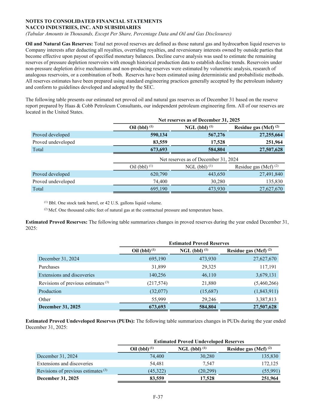 Oil and Natural Gas Reserves: Total net proved reserves are defined as those natural gas and hydrocarbon liquid reserves to Company interests after deducting all royalties, overriding royalties, and reversionary interests owned by outside parties that become effective upon payout of specified monetary balances. Decline curve analysis was used to estimate the remaining reserves of pressure depletion reservoirs with enough historical production data to establish decline trends. Reservoirs under non-pressure depletion drive mechanisms and non-producing reserves were estimated by volumetric analysis, research of analogous reservoirs, or a combination of both. Reserves have been estimated using deterministic and probabilistic methods. All reserves estimates have been prepared using standard engineering practices generally accepted by the petroleum industry and conform to guidelines developed and adopted by the SEC. The following table presents our estimated net proved oil and natural gas reserves as of December 31 based on the reserve report prepared by Haas & Cobb Petroleum Consultants, our independent petroleum engineering firm. All of our reserves are located in the United States. Net reserves as of December 31, 2025 Oil (bbl) (1) NGL (bbl) (1) Residue gas (Mcf) (2) Proved developed 590,134 567,276 27,255,664 Proved undeveloped 83,559 17,528 251,964 Total 673,693 584,804 27,507,628 Net reserves as of December 31, 2024 Oil (bbl) (1) NGL (bbl) (1) Residue gas (Mcf) (2) Proved developed 620,790 443,650 27,491,840 Proved undeveloped 74,400 30,280 135,830 Total 695,190 473,930 27,627,670 (1) Bbl. One stock tank barrel, or 42 U.S. gallons liquid volume. (2) Mcf. One thousand cubic feet of natural gas at the contractual pressure and temperature bases. Estimated Proved Reserves: The following table summarizes changes in proved reserves during the year ended December 31, 2025: Estimated Proved Reserves Oil (bbl) (1) NGL (bbl) (1) Residue gas (Mcf) (2) December 31, 2024 695,190 473,930 27,627,670 Purchases 31,899 29,325 117,191 Extensions and discoveries 140,256 46,110 3,679,131 Revisions of previous estimates (3) (217,574) 21,880 (5,460,266) Production (32,077) (15,687) (1,843,911) Other 55,999 29,246 3,387,813 December 31, 2025 673,693 584,804 27,507,628 Estimated Proved Undeveloped Reserves (PUDs): The following table summarizes changes in PUDs during the year ended December 31, 2025: Estimated Proved Undeveloped Reserves Oil (bbl) (1) NGL (bbl) (1) Residue gas (Mcf) (2) December 31, 2024 74,400 30,280 135,830 Extensions and discoveries 54,481 7,547 172,125 Revisions of previous estimates (3) (45,322) (20,299) (55,991) December 31, 2025 83,559 17,528 251,964 NOTES TO CONSOLIDATED FINANCIAL STATEMENTS NACCO INDUSTRIES, INC. AND SUBSIDIARIES (Tabular Amounts in Thousands, Except Per Share, Percentage Data and Oil and Gas Disclosures) F-37