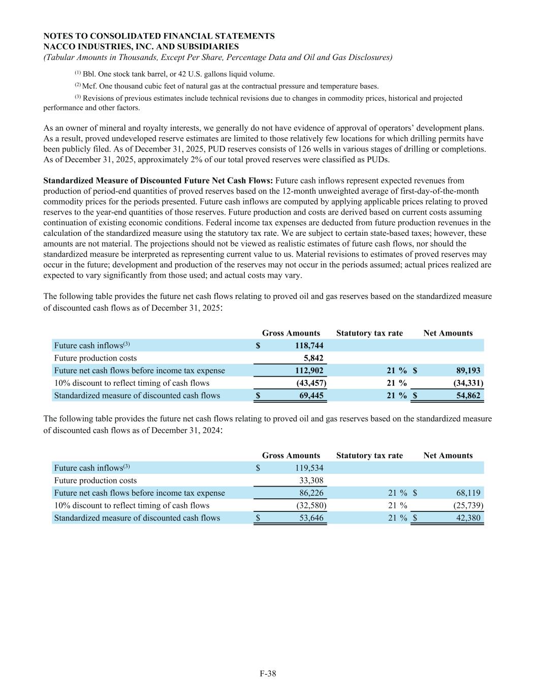 (1) Bbl. One stock tank barrel, or 42 U.S. gallons liquid volume. (2) Mcf. One thousand cubic feet of natural gas at the contractual pressure and temperature bases. (3) Revisions of previous estimates include technical revisions due to changes in commodity prices, historical and projected performance and other factors. As an owner of mineral and royalty interests, we generally do not have evidence of approval of operators’ development plans. As a result, proved undeveloped reserve estimates are limited to those relatively few locations for which drilling permits have been publicly filed. As of December 31, 2025, PUD reserves consists of 126 wells in various stages of drilling or completions. As of December 31, 2025, approximately 2% of our total proved reserves were classified as PUDs. Standardized Measure of Discounted Future Net Cash Flows: Future cash inflows represent expected revenues from production of period-end quantities of proved reserves based on the 12-month unweighted average of first-day-of-the-month commodity prices for the periods presented. Future cash inflows are computed by applying applicable prices relating to proved reserves to the year-end quantities of those reserves. Future production and costs are derived based on current costs assuming continuation of existing economic conditions. Federal income tax expenses are deducted from future production revenues in the calculation of the standardized measure using the statutory tax rate. We are subject to certain state-based taxes; however, these amounts are not material. The projections should not be viewed as realistic estimates of future cash flows, nor should the standardized measure be interpreted as representing current value to us. Material revisions to estimates of proved reserves may occur in the future; development and production of the reserves may not occur in the periods assumed; actual prices realized are expected to vary significantly from those used; and actual costs may vary. The following table provides the future net cash flows relating to proved oil and gas reserves based on the standardized measure of discounted cash flows as of December 31, 2025: Gross Amounts Statutory tax rate Net Amounts Future cash inflows(3) $ 118,744 Future production costs 5,842 Future net cash flows before income tax expense 112,902 21 % $ 89,193 10% discount to reflect timing of cash flows (43,457) 21 % (34,331) Standardized measure of discounted cash flows $ 69,445 21 % $ 54,862 The following table provides the future net cash flows relating to proved oil and gas reserves based on the standardized measure of discounted cash flows as of December 31, 2024: Gross Amounts Statutory tax rate Net Amounts Future cash inflows(3) $ 119,534 Future production costs 33,308 Future net cash flows before income tax expense 86,226 21 % $ 68,119 10% discount to reflect timing of cash flows (32,580) 21 % (25,739) Standardized measure of discounted cash flows $ 53,646 21 % $ 42,380 NOTES TO CONSOLIDATED FINANCIAL STATEMENTS NACCO INDUSTRIES, INC. AND SUBSIDIARIES (Tabular Amounts in Thousands, Except Per Share, Percentage Data and Oil and Gas Disclosures) F-38