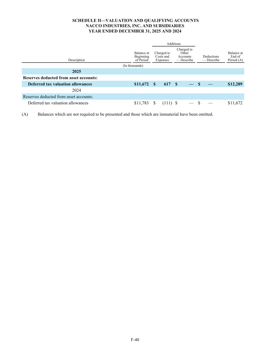 SCHEDULE II—VALUATION AND QUALIFYING ACCOUNTS NACCO INDUSTRIES, INC. AND SUBSIDIARIES YEAR ENDED DECEMBER 31, 2025 AND 2024 Additions Description Balance at Beginning of Period Charged to Costs and Expenses Charged to Other Accounts — Describe Deductions — Describe Balance at End of Period (A) (In thousands) 2025 Reserves deducted from asset accounts: Deferred tax valuation allowances $ 11,672 $ 617 $ — $ — $ 12,289 2024 Reserves deducted from asset accounts: Deferred tax valuation allowances $ 11,783 $ (111) $ — $ — $ 11,672 (A) Balances which are not required to be presented and those which are immaterial have been omitted. F-40