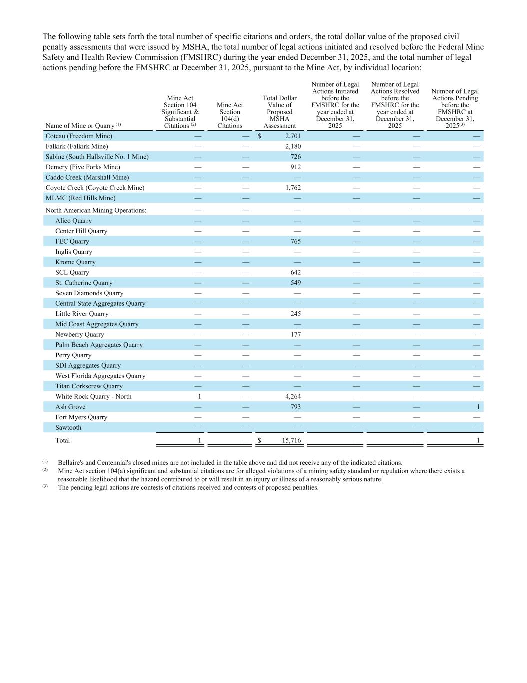 The following table sets forth the total number of specific citations and orders, the total dollar value of the proposed civil penalty assessments that were issued by MSHA, the total number of legal actions initiated and resolved before the Federal Mine Safety and Health Review Commission (FMSHRC) during the year ended December 31, 2025, and the total number of legal actions pending before the FMSHRC at December 31, 2025, pursuant to the Mine Act, by individual location: Name of Mine or Quarry (1) Mine Act Section 104 Significant & Substantial Citations (2) Mine Act Section 104(d) Citations Total Dollar Value of Proposed MSHA Assessment Number of Legal Actions Initiated before the FMSHRC for the year ended at December 31, 2025 Number of Legal Actions Resolved before the FMSHRC for the year ended at December 31, 2025 Number of Legal Actions Pending before the FMSHRC at December 31, 2025(3) Coteau (Freedom Mine) — — $ 2,701 — — — Falkirk (Falkirk Mine) — — 2,180 — — — Sabine (South Hallsville No. 1 Mine) — — 726 — — — Demery (Five Forks Mine) — — 912 — — — Caddo Creek (Marshall Mine) — — — — — — Coyote Creek (Coyote Creek Mine) — — 1,762 — — — MLMC (Red Hills Mine) — — — — — — North American Mining Operations: — — — — — — Alico Quarry — — — — — — Center Hill Quarry — — — — — — FEC Quarry — — 765 — — — Inglis Quarry — — — — — — Krome Quarry — — — — — — SCL Quarry — — 642 — — — St. Catherine Quarry — — 549 — — — Seven Diamonds Quarry — — — — — — Central State Aggregates Quarry — — — — — — Little River Quarry — — 245 — — — Mid Coast Aggregates Quarry — — — — — — Newberry Quarry — — 177 — — — Palm Beach Aggregates Quarry — — — — — — Perry Quarry — — — — — — SDI Aggregates Quarry — — — — — — West Florida Aggregates Quarry — — — — — — Titan Corkscrew Quarry — — — — — — White Rock Quarry - North 1 — 4,264 — — — Ash Grove — — 793 — — 1 Fort Myers Quarry — — — — — — Sawtooth — — — — — — Total 1 — $ 15,716 — — 1 (1) Bellaire's and Centennial's closed mines are not included in the table above and did not receive any of the indicated citations. (2) Mine Act section 104(a) significant and substantial citations are for alleged violations of a mining safety standard or regulation where there exists a reasonable likelihood that the hazard contributed to or will result in an injury or illness of a reasonably serious nature. (3) The pending legal actions are contests of citations received and contests of proposed penalties.