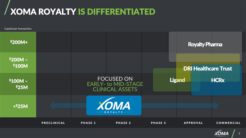XOMA ROYALTY’S BUSINESS MODEL: Path to Sustained THE COMPOUNDING Profitability EFFECT GROWING # of ROYALTIES CASH RECEIPTS ↑ LOW EXPENSES LOW SHARE COUNT INFLECTION POINT HIGH EPS LOW EXPENSES SIGNIFICANT SHARE PRICE APPRECIATION 2023 future 4 4