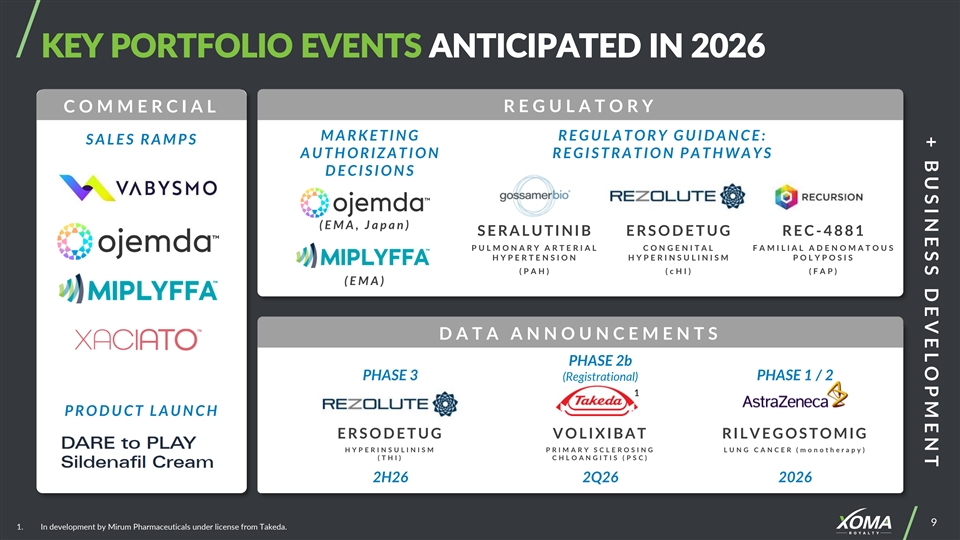 COMMERCIAL PORTFOLIO Provide Stable & Growing Royalty Streams 3Q25YTD FY26 Peak Sales 1 1 Marketer Product Indication Royalties Receipts Sales Est Est Wet AMD, DME, $ $ $ 0.5% 22.5M 5.8B 8.3B RVO $ $ $ r/rpLGG Mid-single digit 8.5M 231M 910M Niemann-Pick $ $ $ Mid-single digit 2.0M 130M 392M Disease Type C $ $ Hemophilia-B Mid-single digit 1.3M 35M n/a Bacterial Low to high- $ < 0.5M n/a n/a Vaginosis single digit 37-75% on $ Acute Pain < 0.5M n/a n/a DoD sales 2 FSAD Low-single digit n/a n/a n/a 1. Consensus per Global Data or selected research analyst estimates if not available. AMD = Age-related Macular Degeneration, DME = Diabetic Macular Edema, RVO = Retinal Vein Occlusion, r/rpLGG = Relapsed or 8 2. Commercial availability through a 503B outsourcing facility. Progressive Pediatric Low-Grade Glioma, FSAD = Female Sexual Arousal Disorder, DoD = Department of Defense
