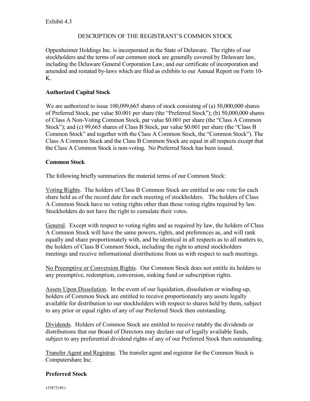 Exhibit 4.3 153872149.1 DESCRIPTION OF THE REGISTRANT’S COMMON STOCK Oppenheimer Holdings Inc. is incorporated in the State of Delaware. The rights of our stockholders and the terms of our common stock are generally covered by Delaware law, including the Delaware General Corporation Law, and our certificate of incorporation and amended and restated by-laws which are filed as exhibits to our Annual Report on Form 10- K. Authorized Capital Stock We are authorized to issue 100,099,665 shares of stock consisting of (a) 50,000,000 shares of Preferred Stock, par value $0.001 per share (the “Preferred Stock”); (b) 50,000,000 shares of Class A Non-Voting Common Stock, par value $0.001 per share (the “Class A Common Stock”); and (c) 99,665 shares of Class B Stock, par value $0.001 per share (the “Class B Common Stock” and together with the Class A Common Stock, the “Common Stock”). The Class A Common Stock and the Class B Common Stock are equal in all respects except that the Class A Common Stock is non-voting. No Preferred Stock has been issued. Common Stock The following briefly summarizes the material terms of our Common Stock: Voting Rights. The holders of Class B Common Stock are entitled to one vote for each share held as of the record date for each meeting of stockholders. The holders of Class A Common Stock have no voting rights other than those voting rights required by law. Stockholders do not have the right to cumulate their votes. General. Except with respect to voting rights and as required by law, the holders of Class A Common Stock will have the same powers, rights, and preferences as, and will rank equally and share proportionately with, and be identical in all respects as to all matters to, the holders of Class B Common Stock, including the right to attend stockholders meetings and receive informational distributions from us with respect to such meetings. No Preemptive or Conversion Rights. Our Common Stock does not entitle its holders to any preemptive, redemption, conversion, sinking fund or subscription rights. Assets Upon Dissolution. In the event of our liquidation, dissolution or winding-up, holders of Common Stock are entitled to receive proportionately any assets legally available for distribution to our stockholders with respect to shares held by them, subject to any prior or equal rights of any of our Preferred Stock then outstanding. Dividends. Holders of Common Stock are entitled to receive ratably the dividends or distributions that our Board of Directors may declare out of legally available funds, subject to any preferential dividend rights of any of our Preferred Stock then outstanding. Transfer Agent and Registrar. The transfer agent and registrar for the Common Stock is Computershare Inc. Preferred Stock