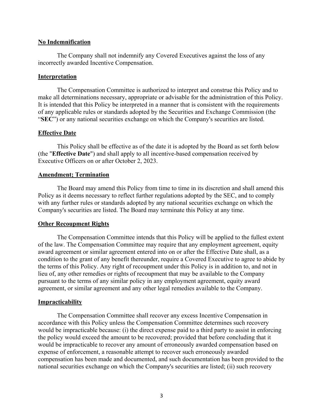 3 No Indemnification The Company shall not indemnify any Covered Executives against the loss of any incorrectly awarded Incentive Compensation. Interpretation The Compensation Committee is authorized to interpret and construe this Policy and to make all determinations necessary, appropriate or advisable for the administration of this Policy. It is intended that this Policy be interpreted in a manner that is consistent with the requirements of any applicable rules or standards adopted by the Securities and Exchange Commission (the “SEC”) or any national securities exchange on which the Company's securities are listed. Effective Date This Policy shall be effective as of the date it is adopted by the Board as set forth below (the "Effective Date") and shall apply to all incentive-based compensation received by Executive Officers on or after October 2, 2023. Amendment; Termination The Board may amend this Policy from time to time in its discretion and shall amend this Policy as it deems necessary to reflect further regulations adopted by the SEC, and to comply with any further rules or standards adopted by any national securities exchange on which the Company's securities are listed. The Board may terminate this Policy at any time. Other Recoupment Rights The Compensation Committee intends that this Policy will be applied to the fullest extent of the law. The Compensation Committee may require that any employment agreement, equity award agreement or similar agreement entered into on or after the Effective Date shall, as a condition to the grant of any benefit thereunder, require a Covered Executive to agree to abide by the terms of this Policy. Any right of recoupment under this Policy is in addition to, and not in lieu of, any other remedies or rights of recoupment that may be available to the Company pursuant to the terms of any similar policy in any employment agreement, equity award agreement, or similar agreement and any other legal remedies available to the Company. Impracticability The Compensation Committee shall recover any excess Incentive Compensation in accordance with this Policy unless the Compensation Committee determines such recovery would be impracticable because: (i) the direct expense paid to a third party to assist in enforcing the policy would exceed the amount to be recovered; provided that before concluding that it would be impracticable to recover any amount of erroneously awarded compensation based on expense of enforcement, a reasonable attempt to recover such erroneously awarded compensation has been made and documented, and such documentation has been provided to the national securities exchange on which the Company's securities are listed; (ii) such recovery