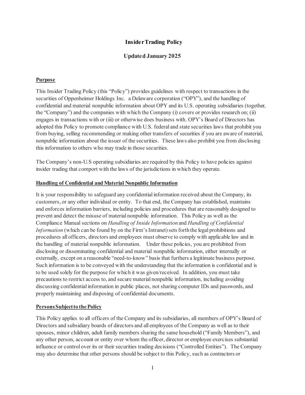 1 Insider Trading Policy Updated January 2025 Purpose This Insider Trading Policy (this “Policy”) provides guidelines with respect to transactions in the securities of Oppenheimer Holdings Inc. a Delaware corporation (“OPY”), and the handling of confidential and material nonpublic information about OPY and its U.S. operating subsidiaries (together, the “Company”) and the companies with which the Company (i) covers or provides research on; (ii) engages in transactions with or (iii) or otherwise does business with. OPY’s Board of Directors has adopted this Policy to promote compliance with U.S. federal and state securities laws that prohibit you from buying, selling recommending or making other transfers of securities if you are aware of material, nonpublic information about the issuer of the securities. These laws also prohibit you from disclosing this information to others who may trade in those securities. The Company’s non-U.S operating subsidiaries are required by this Policy to have policies against insider trading that comport with the laws of the jurisdictions in which they operate. Handling of Confidential and Material Nonpublic Information It is your responsibility to safeguard any confidential information received about the Company, its customers, or any other individual or entity. To that end, the Company has established, maintains and enforces information barriers, including policies and procedures that are reasonably designed to prevent and detect the misuse of material nonpublic information. This Policy as well as the Compliance Manual sections on Handling of Inside Information and Handling of Confidential Information (which can be found by on the Firm’s Intranet) sets forth the legal prohibitions and procedures all officers, directors and employees must observe to comply with applicable law and in the handling of material nonpublic information. Under these policies, you are prohibited from disclosing or disseminating confidential and material nonpublic information, either internally or externally, except on a reasonable “need-to-know” basis that furthers a legitimate business purpose. Such information is to be conveyed with the understanding that the information is confidential and is to be used solely for the purpose for which it was given/received. In addition, you must take precautions to restrict access to, and secure material nonpublic information, including avoiding discussing confidential information in public places, not sharing computer IDs and passwords, and properly maintaining and disposing of confidential documents. Persons Subject to the Policy This Policy applies to all officers of the Company and its subsidiaries, all members of OPY’s Board of Directors and subsidiary boards of directors and all employees of the Company as well as to their spouses, minor children, adult family members sharing the same household (“Family Members”), and any other person, account or entity over whom the officer, director or employee exercises substantial influence or control over its or their securities trading decisions (“Controlled Entities”). The Company may also determine that other persons should be subject to this Policy, such as contractors or