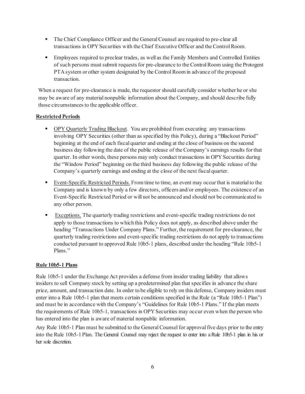 6 The Chief Compliance Officer and the General Counsel are required to pre-clear all transactions in OPY Securities with the Chief Executive Officer and the Control Room. Employees required to preclear trades, as well as the Family Members and Controlled Entities of such persons must submit requests for pre-clearance to the Control Room using the Protogent PTA system or other system designated by the Control Room in advance of the proposed transaction. When a request for pre-clearance is made, the requestor should carefully consider whether he or she may be aware of any material nonpublic information about the Company, and should describe fully those circumstances to the applicable officer. Restricted Periods OPY Quarterly Trading Blackout. You are prohibited from executing any transactions involving OPY Securities (other than as specified by this Policy), during a “Blackout Period” beginning at the end of each fiscal quarter and ending at the close of business on the second business day following the date of the public release of the Company’s earnings results for that quarter. In other words, these persons may only conduct transactions in OPY Securities during the “Window Period” beginning on the third business day following the public release of the Company’s quarterly earnings and ending at the close of the next fiscal quarter. Event-Specific Restricted Periods. From time to time, an event may occur that is material to the Company and is known by only a few directors, officers and/or employees. The existence of an Event-Specific Restricted Period or will not be announced and should not be communicated to any other person. Exceptions. The quarterly trading restrictions and event-specific trading restrictions do not apply to those transactions to which this Policy does not apply, as described above under the heading “Transactions Under Company Plans.” Further, the requirement for pre-clearance, the quarterly trading restrictions and event-specific trading restrictions do not apply to transactions conducted pursuant to approved Rule 10b5-1 plans, described under the heading “Rule 10b5-1 Plans.” Rule 10b5-1 Plans Rule 10b5-1 under the Exchange Act provides a defense from insider trading liability that allows insiders to sell Company stock by setting up a predetermined plan that specifies in advance the share price, amount, and transaction date. In order to be eligible to rely on this defense, Company insiders must enter into a Rule 10b5-1 plan that meets certain conditions specified in the Rule (a “Rule 10b5-1 Plan”) and must be in accordance with the Company’s “Guidelines for Rule 10b5-1 Plans.” If the plan meets the requirements of Rule 10b5-1, transactions in OPY Securities may occur even when the person who has entered into the plan is aware of material nonpublic information. Any Rule 10b5-1 Plan must be submitted to the General Counsel for approval five days prior to the entry into the Rule 10b5-1 Plan. The General Counsel may reject the request to enter into a Rule 10b5-1 plan in his or her sole discretion.