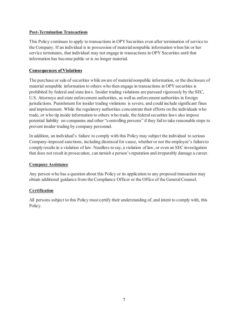 7 Post-Termination Transactions This Policy continues to apply to transactions in OPY Securities even after termination of service to the Company. If an individual is in possession of material nonpublic information when his or her service terminates, that individual may not engage in transactions in OPY Securities until that information has become public or is no longer material. Consequences of Violations The purchase or sale of securities while aware of material nonpublic information, or the disclosure of material nonpublic information to others who then engage in transactions in OPY securities is prohibited by federal and state laws. Insider trading violations are pursued vigorously by the SEC, U.S. Attorneys and state enforcement authorities, as well as enforcement authorities in foreign jurisdictions. Punishment for insider trading violations is severe, and could include significant fines and imprisonment. While the regulatory authorities concentrate their efforts on the individuals who trade, or who tip inside information to others who trade, the federal securities laws also impose potential liability on companies and other “controlling persons” if they fail to take reasonable steps to prevent insider trading by company personnel. In addition, an individual’s failure to comply with this Policy may subject the individual to serious Company-imposed sanctions, including dismissal for cause, whether or not the employee’s failure to comply results in a violation of law. Needless to say, a violation of law, or even an SEC investigation that does not result in prosecution, can tarnish a person’s reputation and irreparably damage a career. Company Assistance Any person who has a question about this Policy or its application to any proposed transaction may obtain additional guidance from the Compliance Officer or the Office of the General Counsel. Certification All persons subject to this Policy must certify their understanding of, and intent to comply with, this Policy.