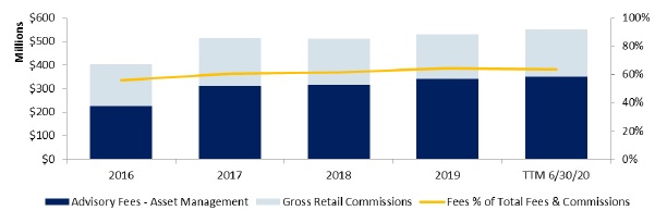 Revenues from our Asset Management division consist of investment advisory and transactional fees for advisory services as well as from revenue sharing arrangements with registered and private alternative investment vehicles. Investment advisory fees are earned on all assets held in discretionary and non-discretionary asset-based programs. These fees are typically billed quarterly, in advance, and are calculated as a percent of assets under management at the end of the prior quarter. Management and incentive fees from revenue sharing arrangements in alternative investments are calculated on a pre-determined basis with registered and private investment companies. The investment advisory fees on products offered by our Asset Management division provide us with a recurring and predictable revenue stream. We have built a solid platform of support functions within our Asset Management division, such as sales and marketing and trade execution, to assist our financial advisors in providing financial wealth planning services. As a result, advisory fees have become an increasingly larger portion of our overall revenues in our Private Client and Asset Management divisions. For the six-month period ended June 30, 2020, advisory fees from our managed product business as a percentage of our advisory fees plus commissions from our transaction-based business was 60.3%. Reg BI may make our asset management business even more critical in the future as clients migrate to fee-based services and away from transactional pricing.